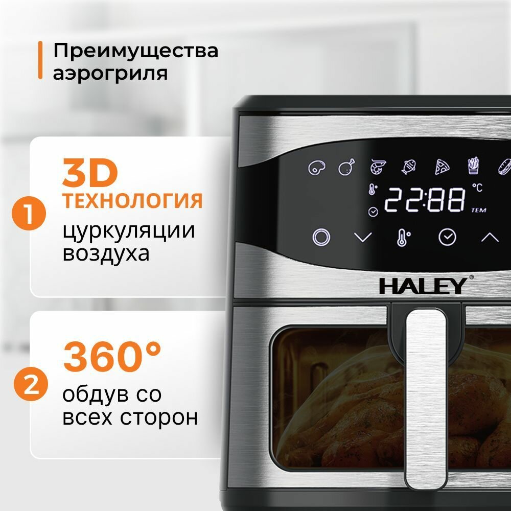HALEY-2511 Аэрогриль электрический 8 в 1, объем 10 л, мощность 2000 Вт, мультипечь 8 программ, с сенсорным управлением