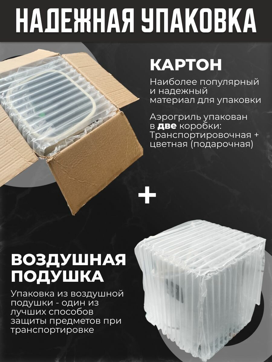 | В комплекте | антипригарная решетка, инструкция, книга рецептов, пергаментные тарелки, резиновые подушки |