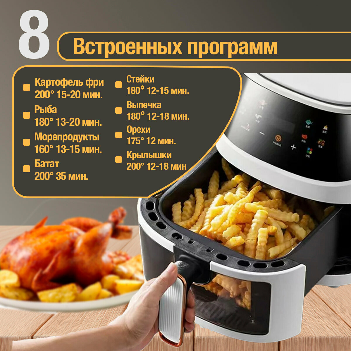 Аэрогриль электрический для дома, сенсорный, настольный, объем 6 литров, мощность 1350 Вт, белый интересное: