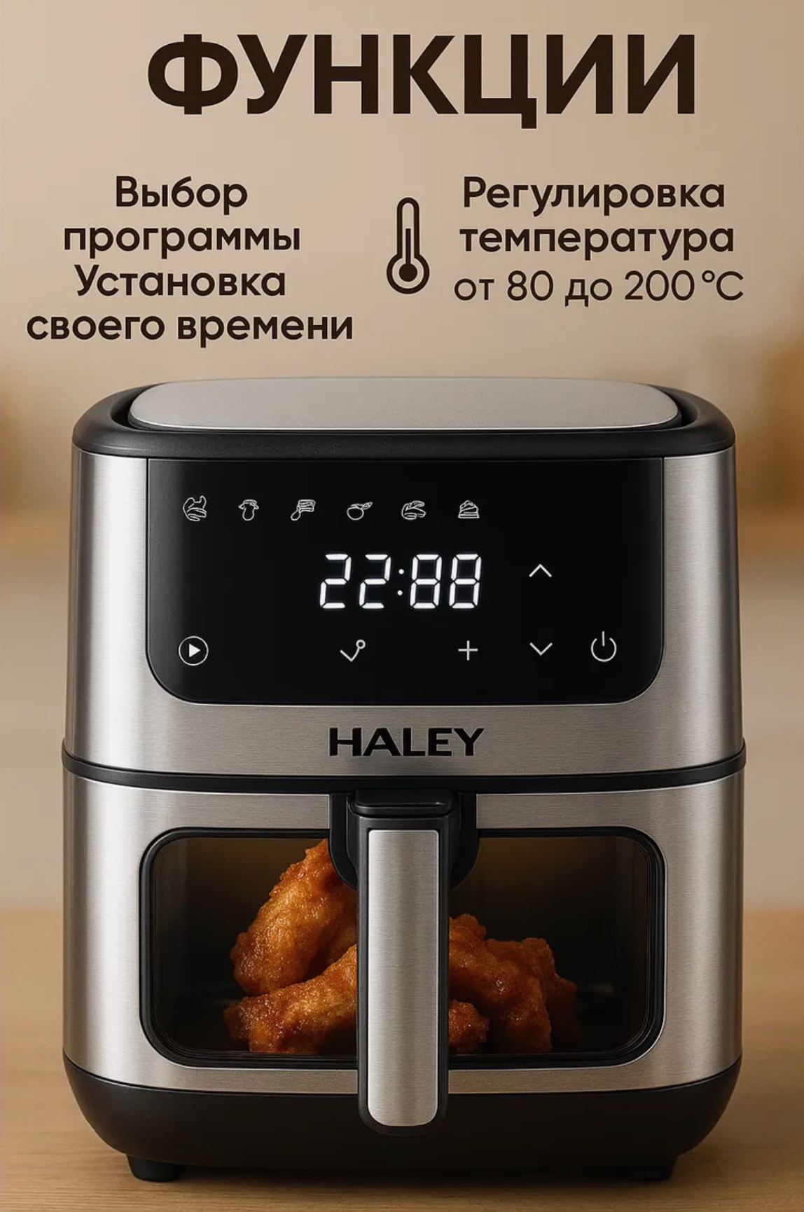 Аэрогриль Haley, 8 л, мощность 2000 Вт, электронное управление, 3D-нагрев интересное:
