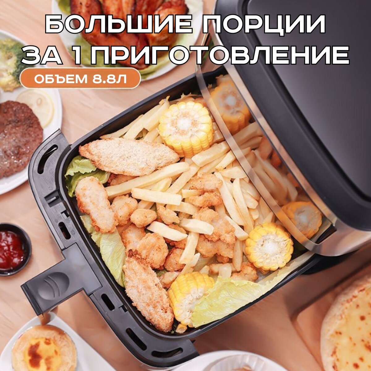 Аэрогриль, мощность 1500 Вт, регулировка температуры, объем чаши 8.8 л интересное: