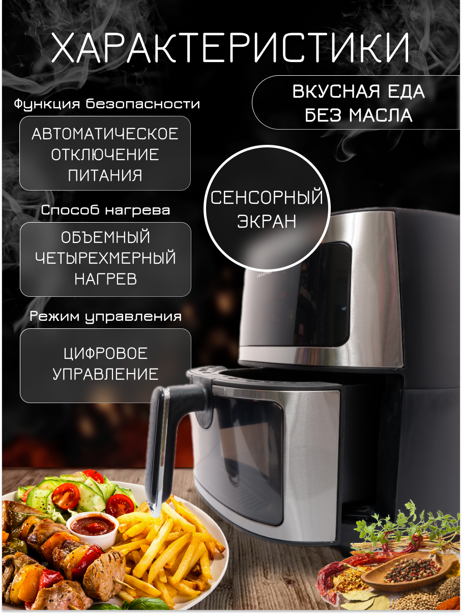 Аэрогриль, аэрофритюрница электрическая, 8 программ приготовления, объем 6 л, мультипечь для кухни 1350 Вт интересное: