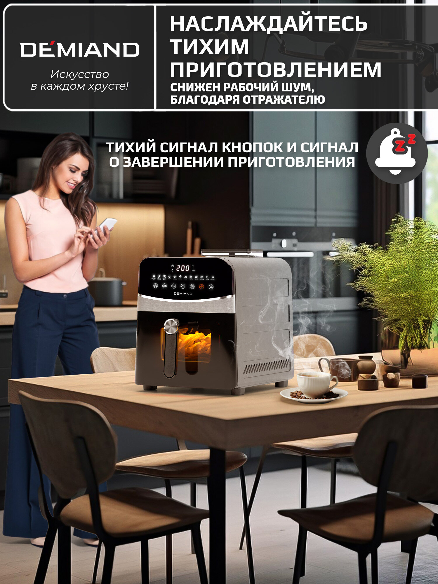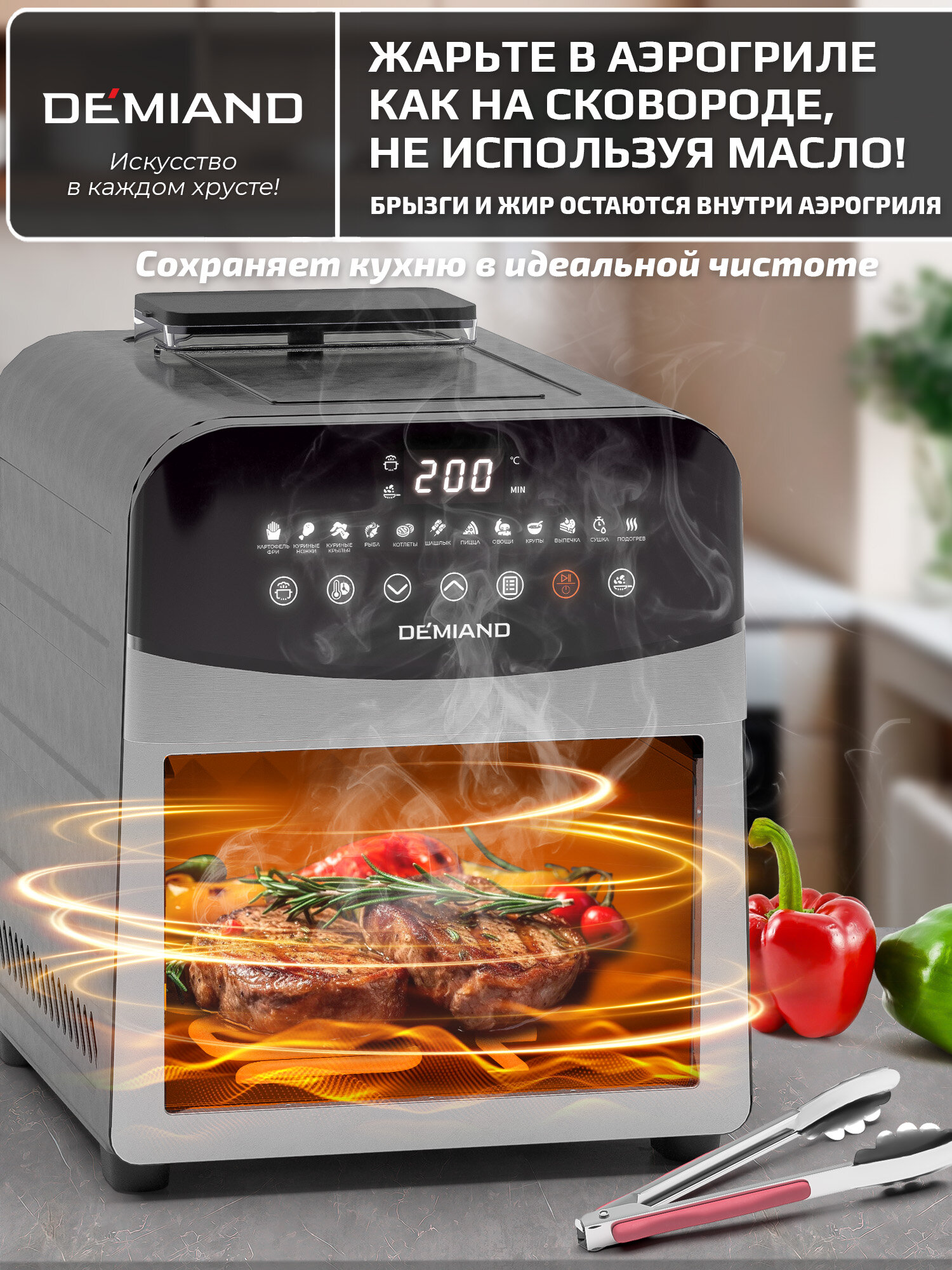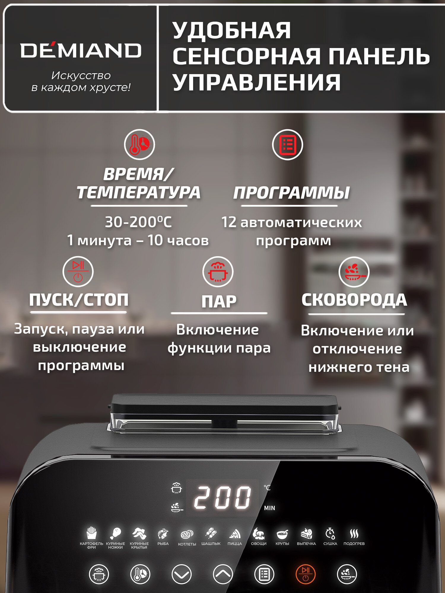 Инновационный аэрогриль DEMIAND SANDERS с технологией приготовления на Пару, чаша на 6 литров, разморозка, визуальное окно, сенсорная панель, стальной корпус, 1950W, DK-2200, черный
