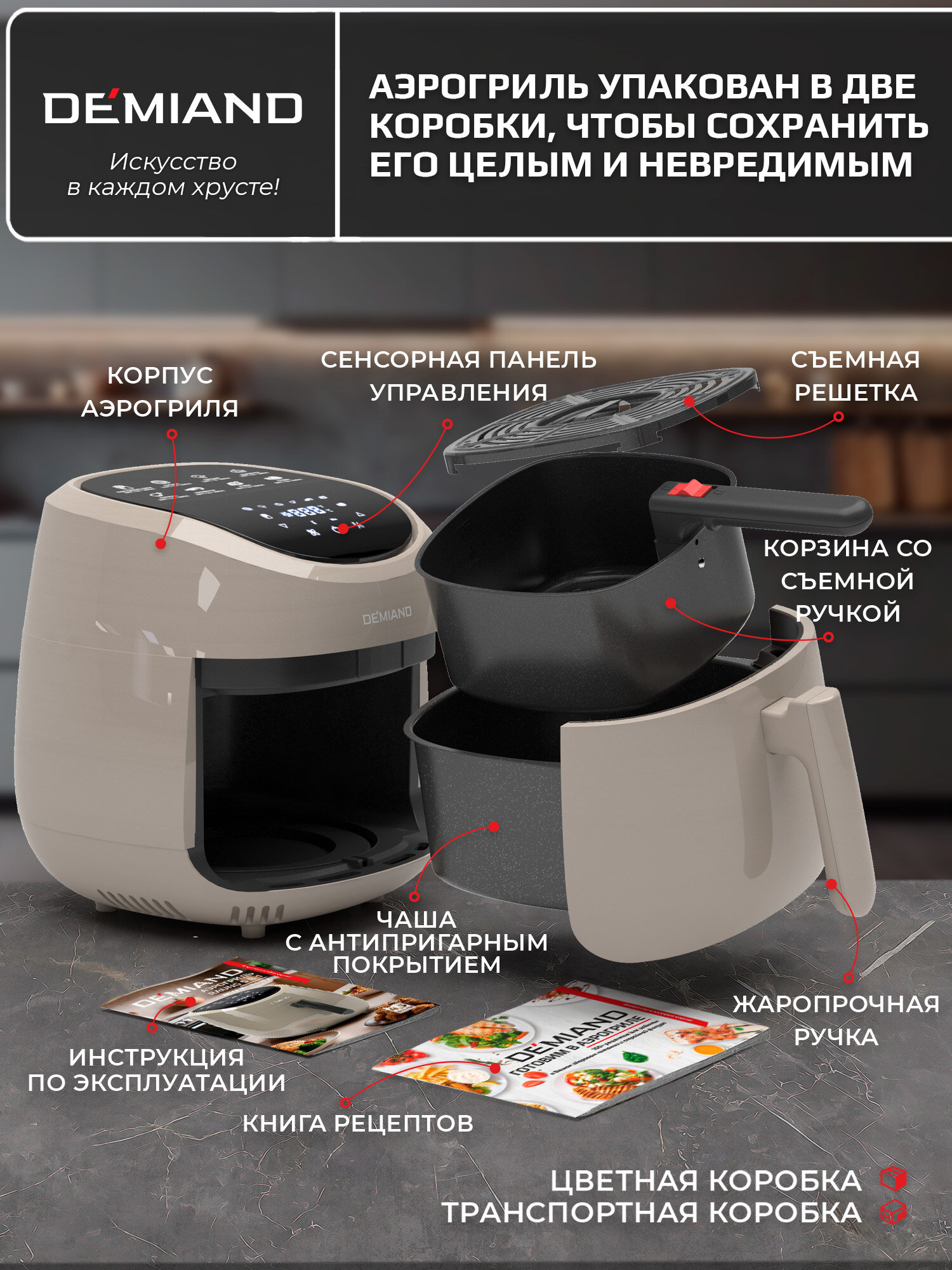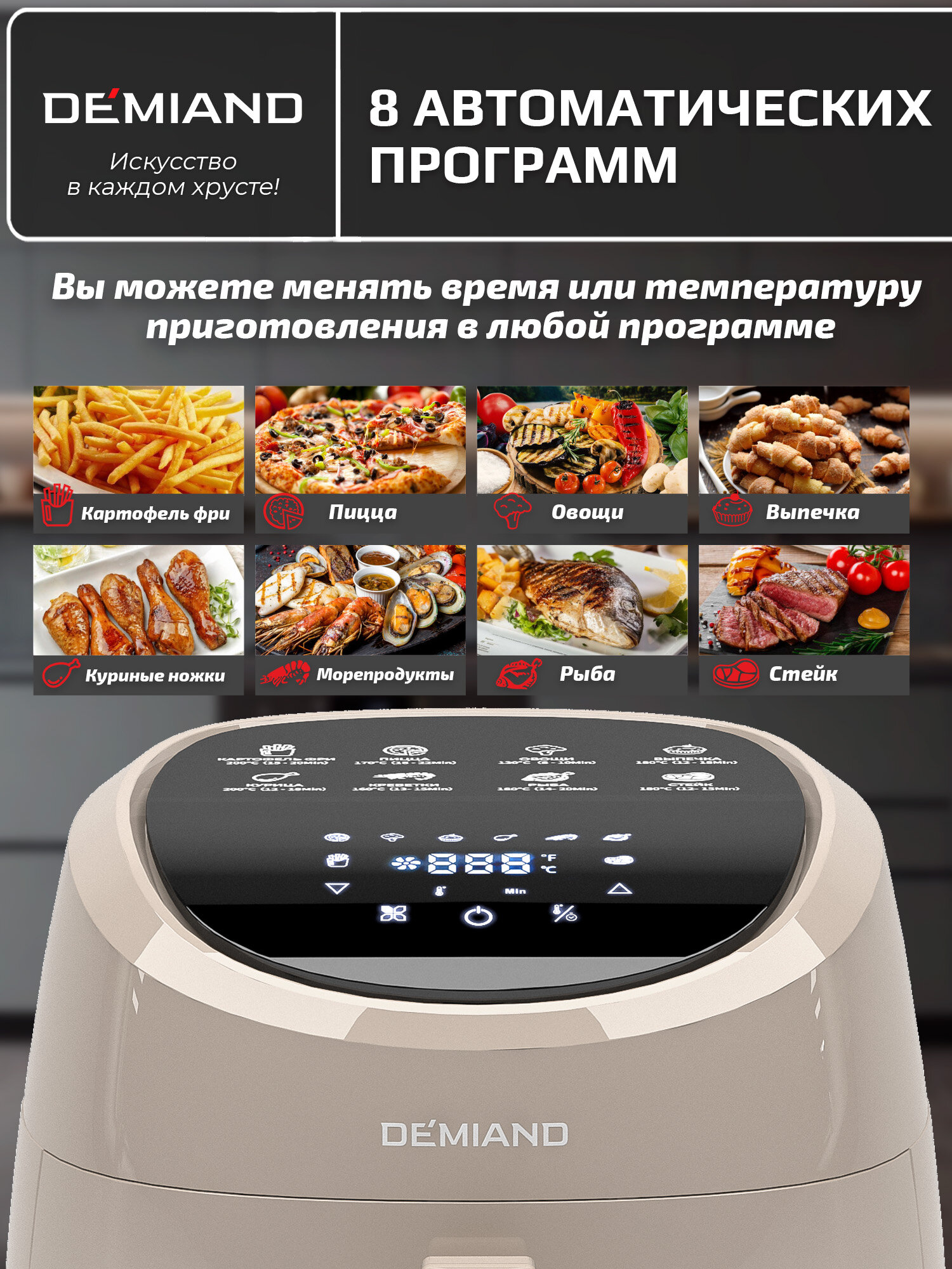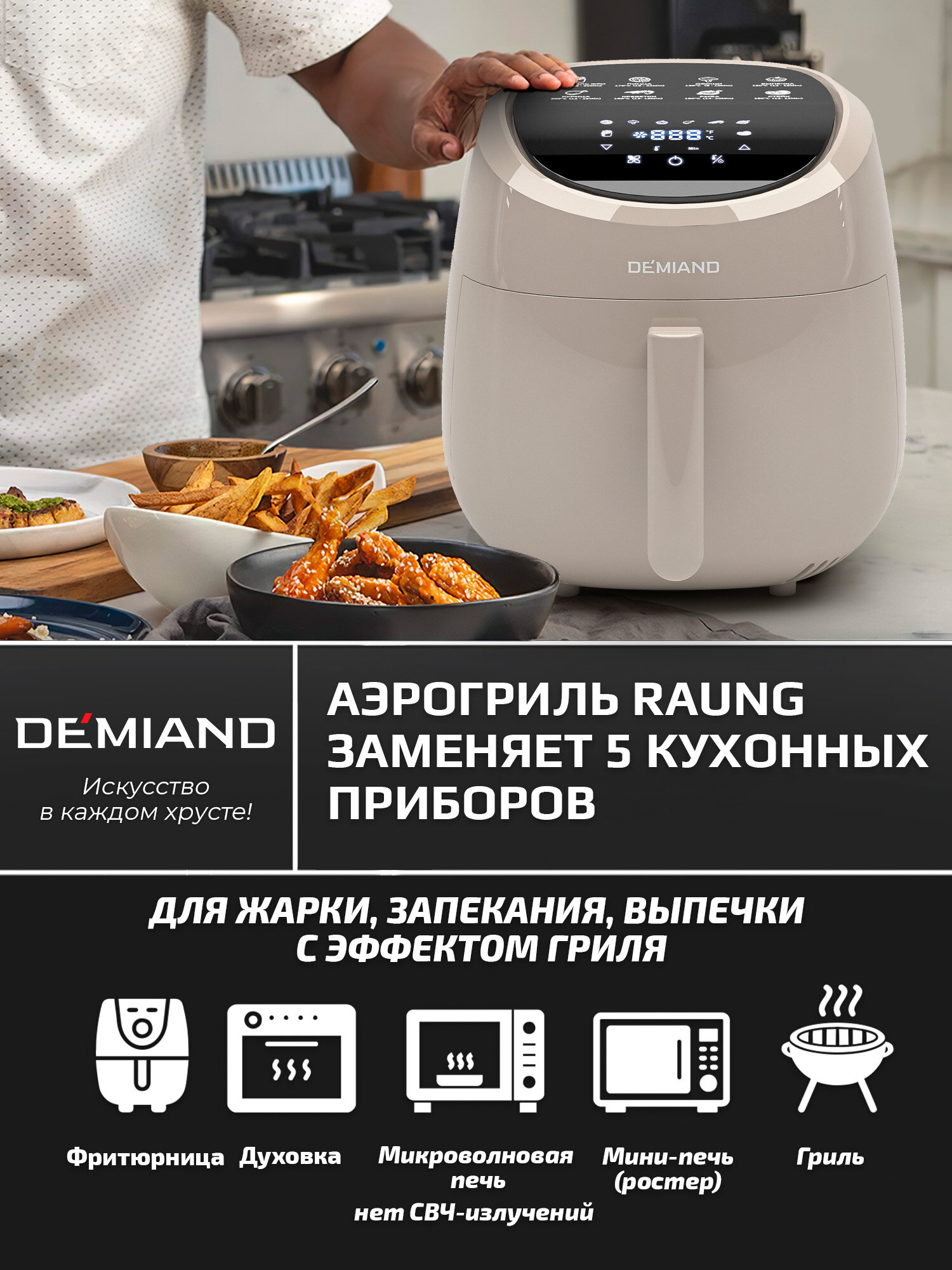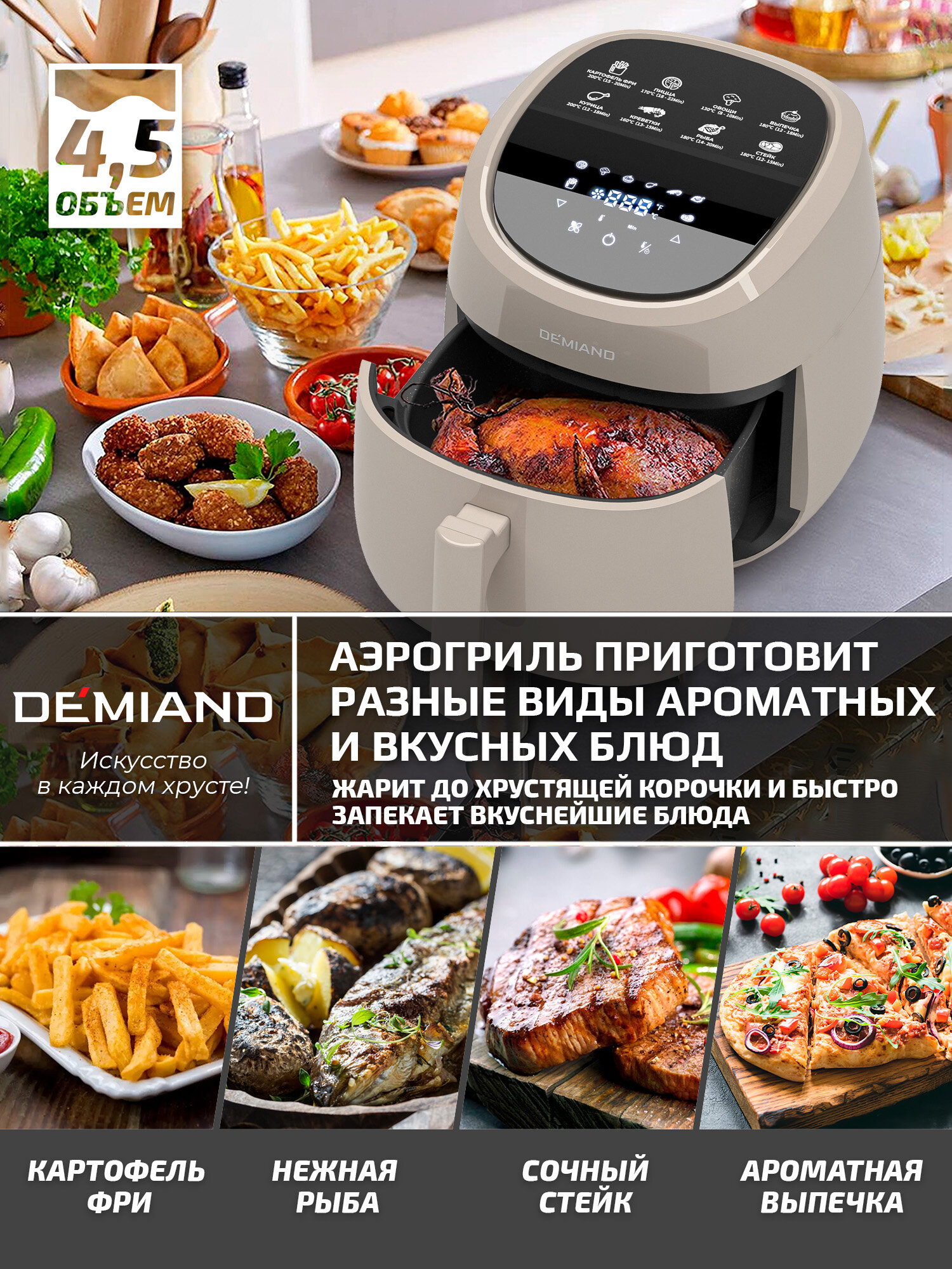 Купить Аэрогриль DEMIAND RAUNG 5 в 1 8 автоматических программ, книга рецептов, бежевый, объем 4,5 литра,1400Вт