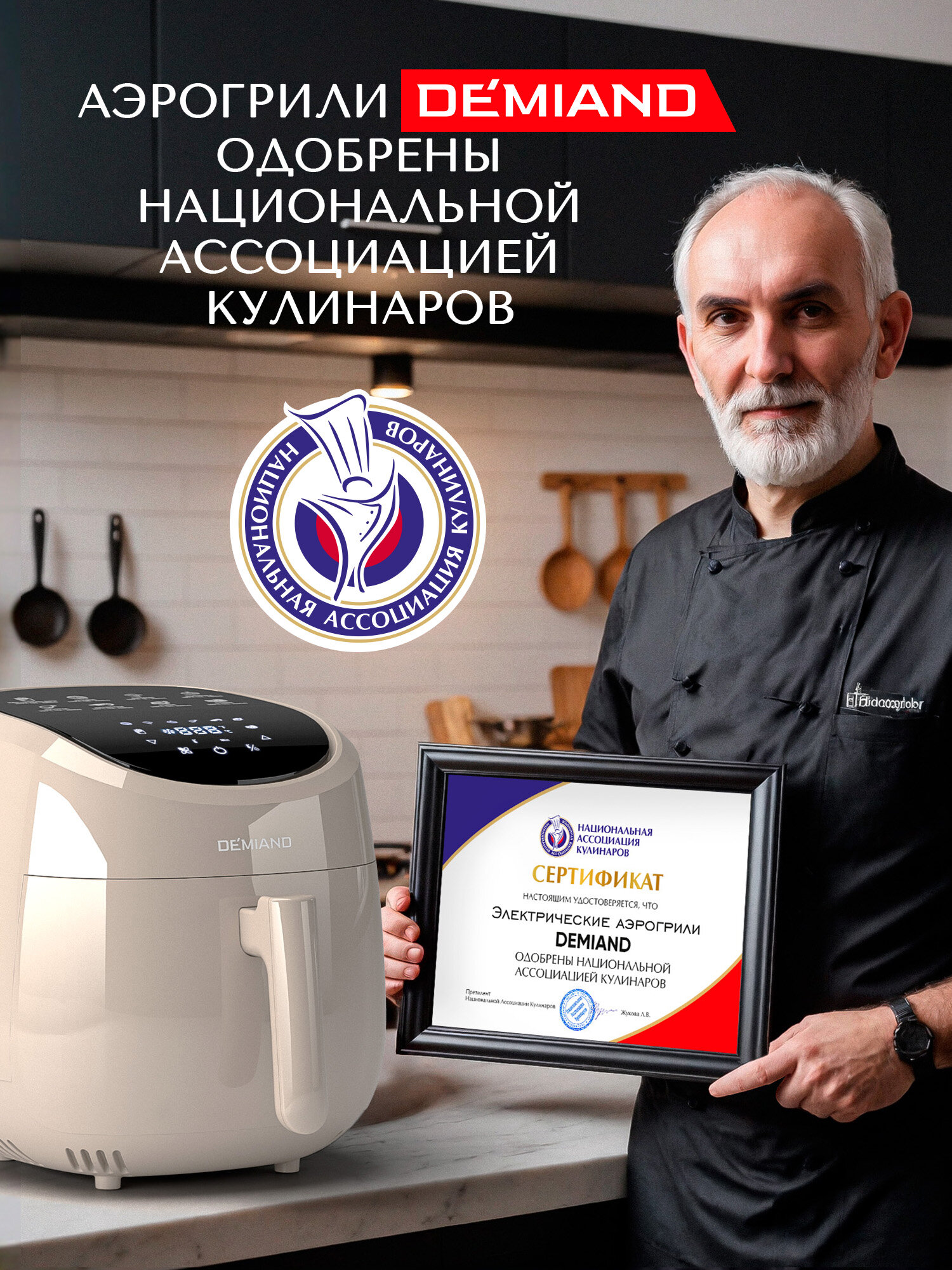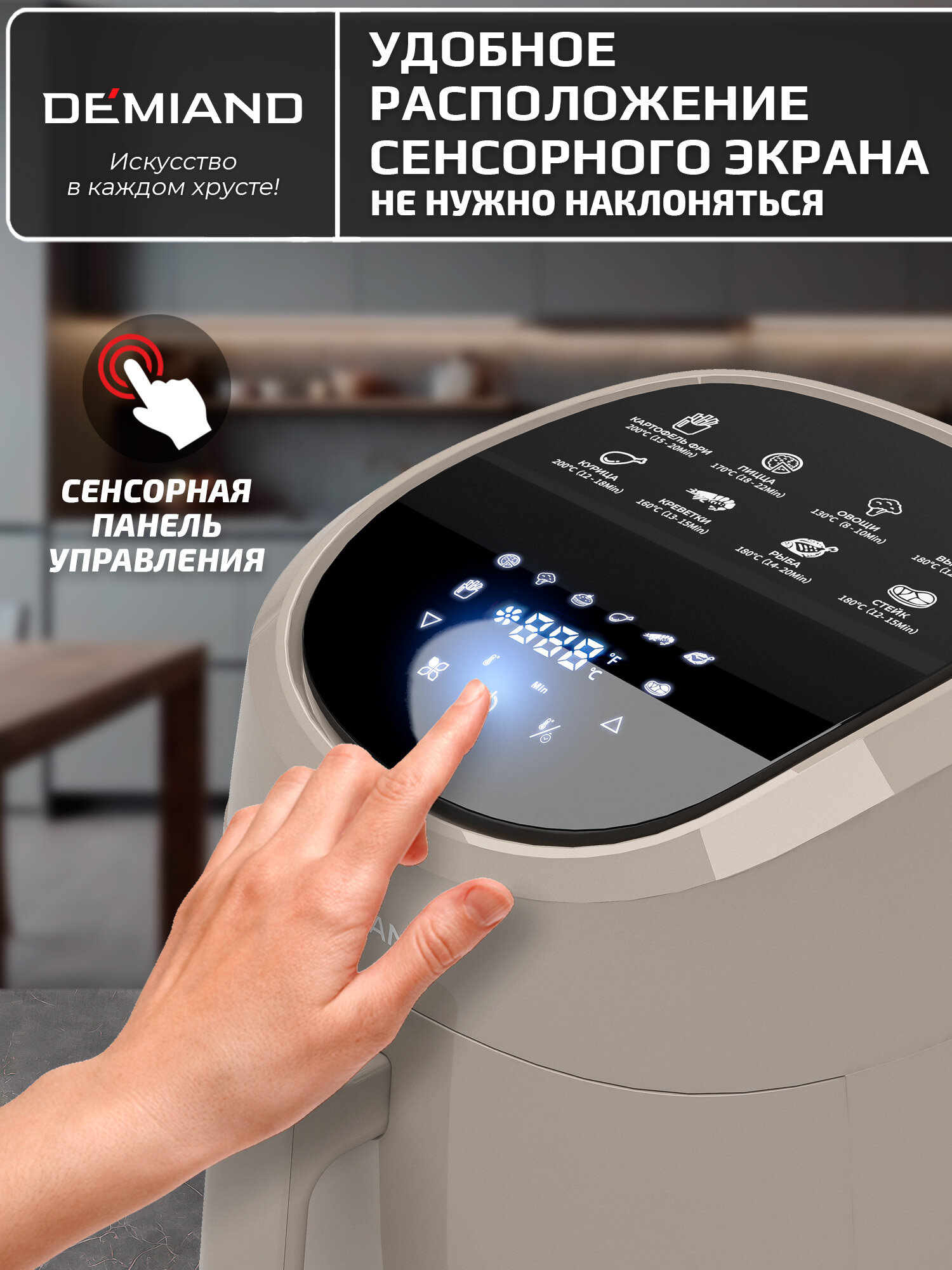 Инновационный аэрогриль DEMIAND SANDERS с технологией приготовления на Пару, чаша на 6 литров, разморозка, визуальное окно, сенсорная панель, стальной корпус, 1950W, DK-2200, белый