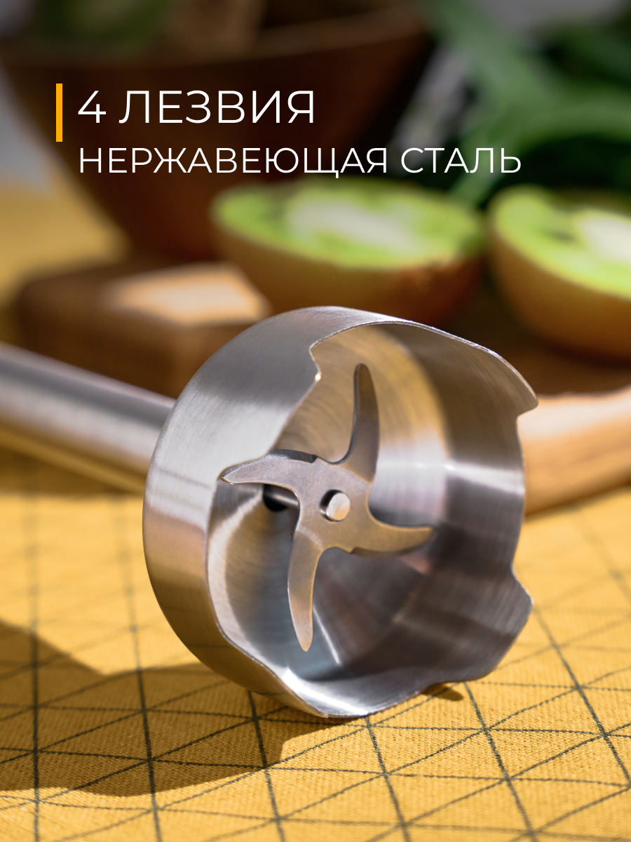 | Дополнительная информация | Острый нож из нержавеющей стали; Эргономичный дизайн; Кнопочное управление; Защита от разбрызгивания; Съемные насадки; Быстрый старт; Легко разбирается для ухода и хранения; Венчик и измельчитель в комплекте. |