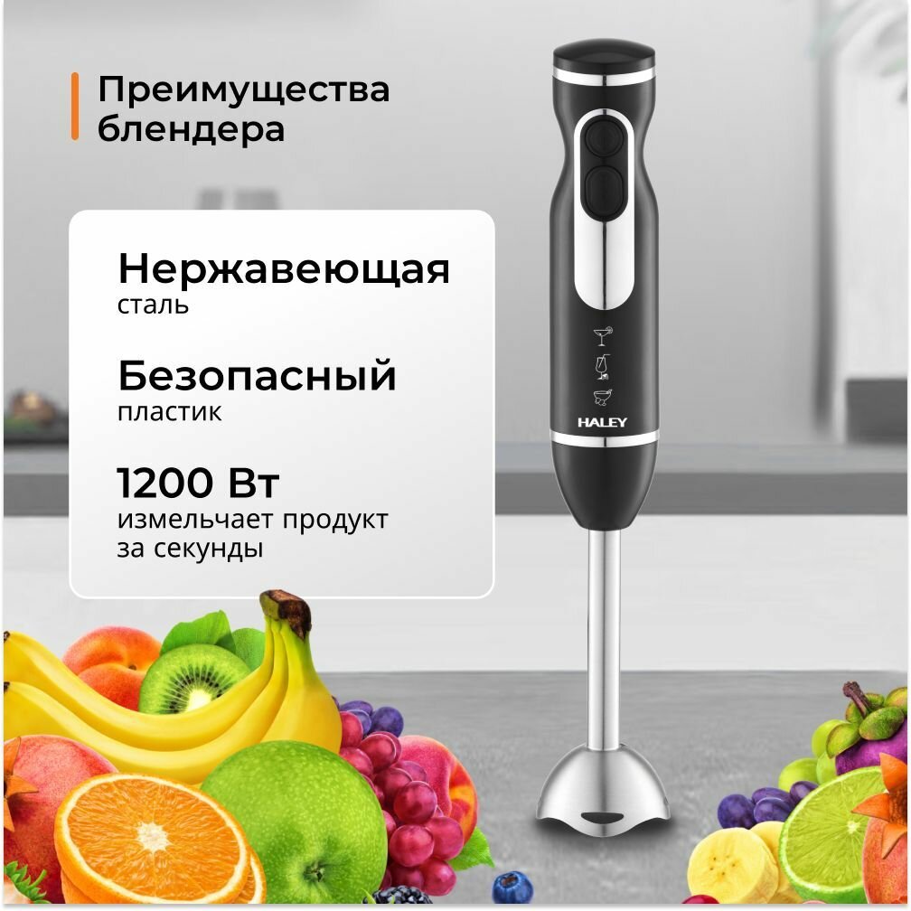 СохранитьМногофункциональный блендер погружной HALEY-1114 с регулятором мощности, турбо режим2 скоростями, 1200 Вт, черный, серый металлик интересное: