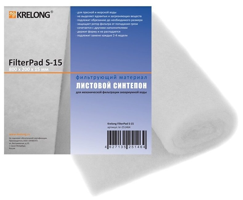 Krelong FilterPad S-15, листовой синтепон тонкой очистки для всех аквариумных фильтров, 800х200х15мм интересное: