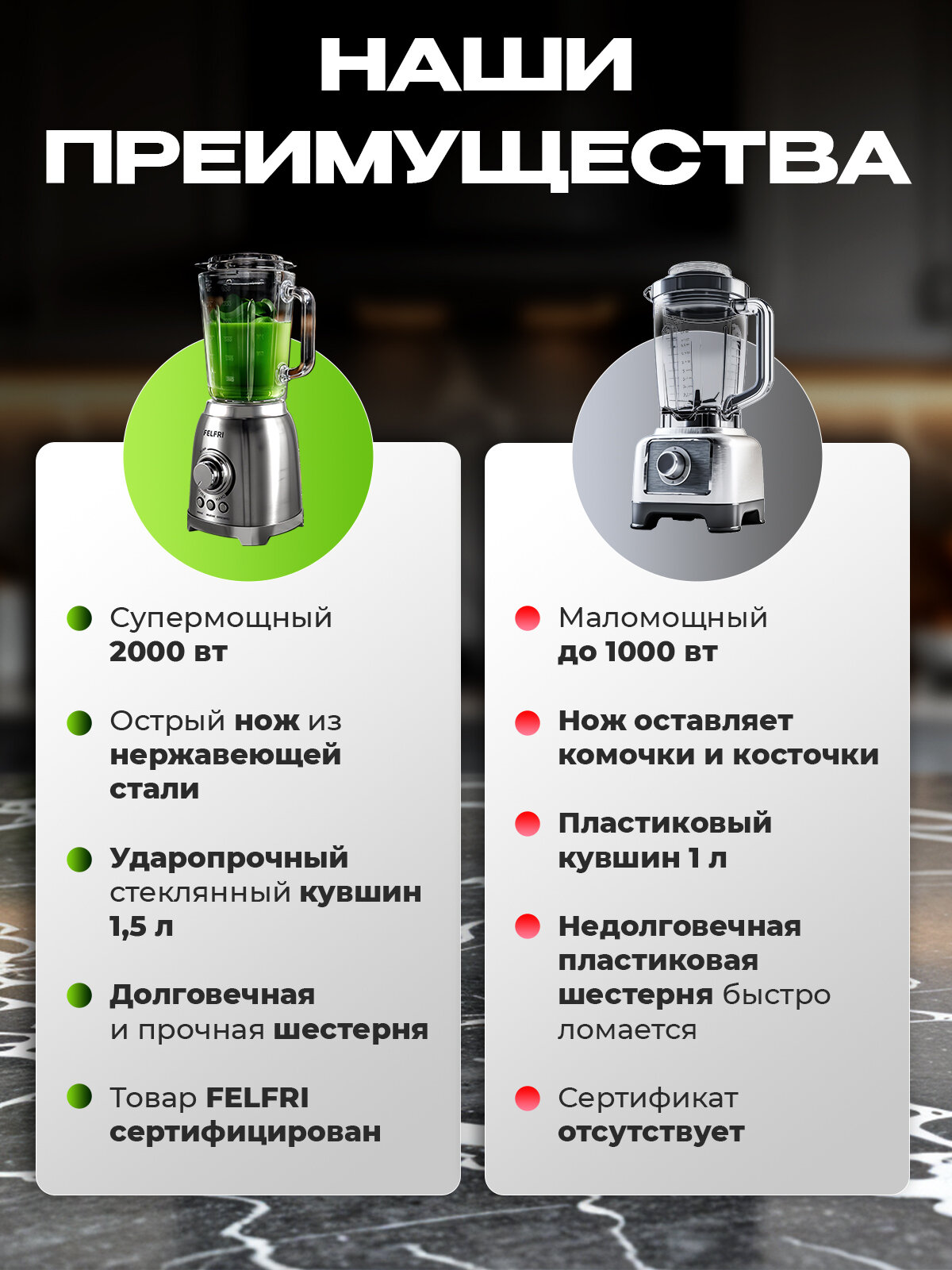 Блендер FELFRI, для смузи, стационарный, 2000Вт, стеклянная чаша 1,5л, нержавеющая сталь интересное: