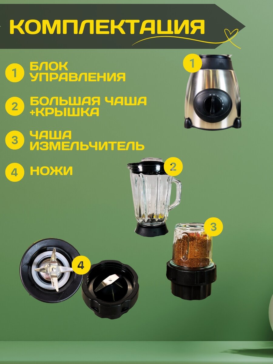 Блендер cтационарный для смузи коктейлей, измельчитель, кофемолка, со стеклянной чашей 1,5л