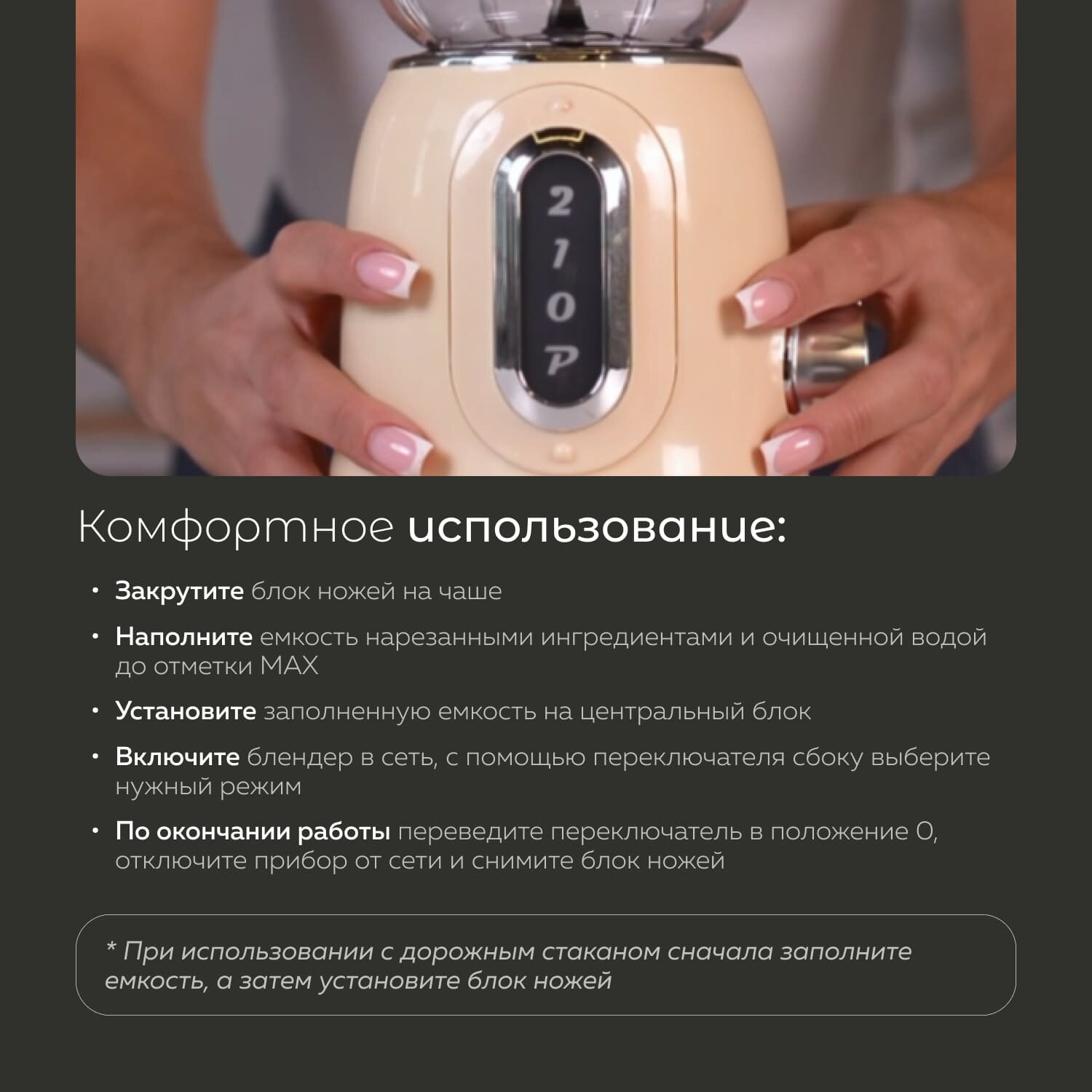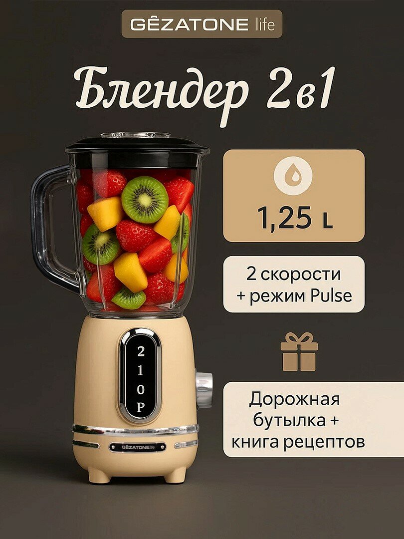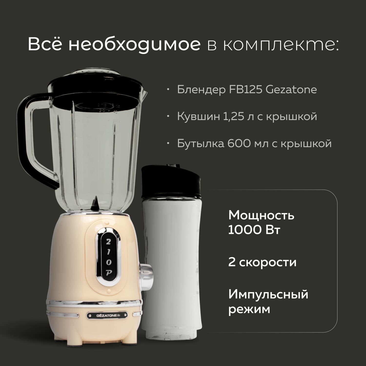 | Комплектация | Центральный блок, стационарная чаша (1,25 л), переносная бутылка (0,6 л), крышка чаши, пробка, блок ножей, инструкция. |