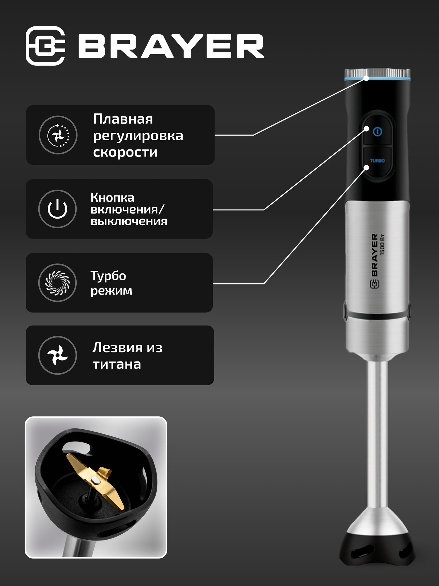 Блендер погружной Brayer BR1265, насадка-миксер, 1500Вт, с измельчителем 600мл и стаканом 800мл интересное: