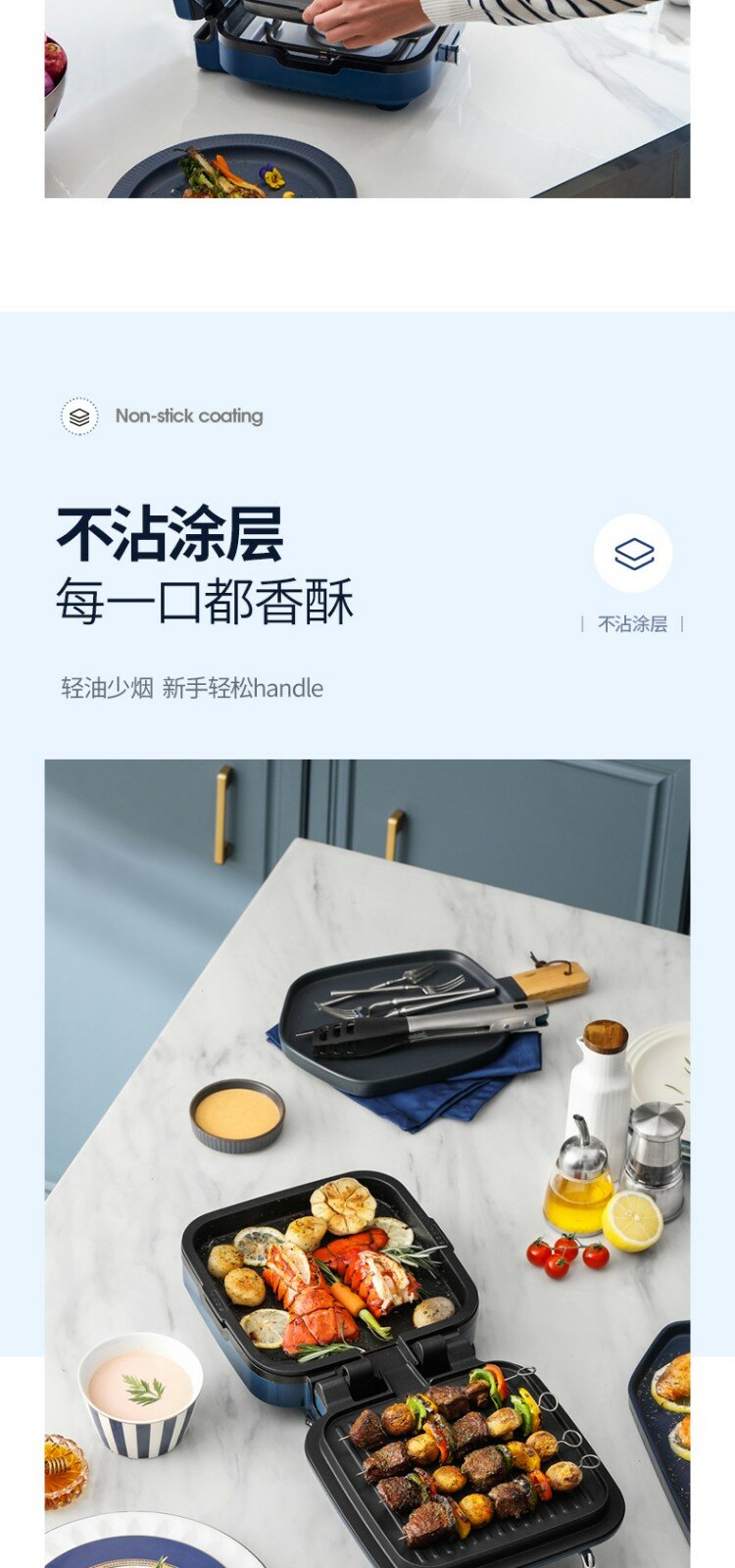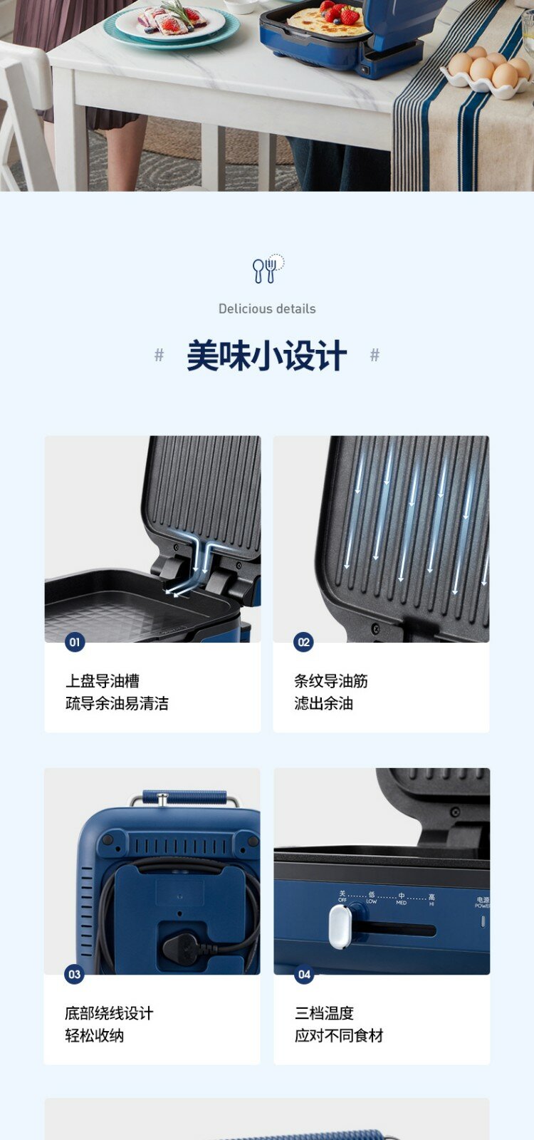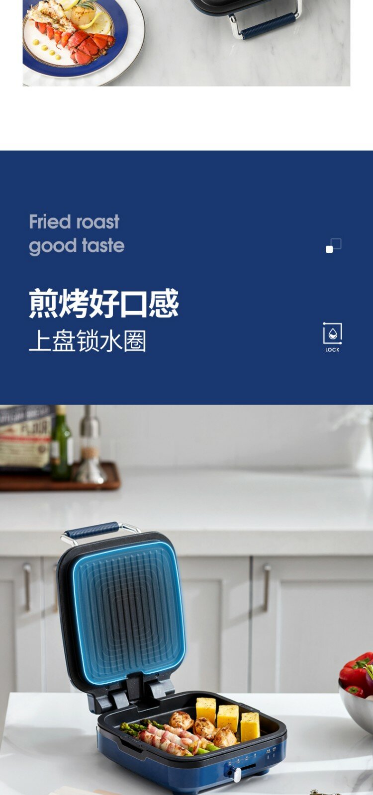 | Дополнительная информация | силиконовая ручка на верхней крышке, конструкция для намотки шнура в нижней части, съемная нижняя форма для выпечки, плавающая конструкция шарнира, независимый контроль температуры верхней и нижней форм для выпечки, верхняя форма для выпечки открывается на 180°, слив для излишков масла, быстрый нагрев |