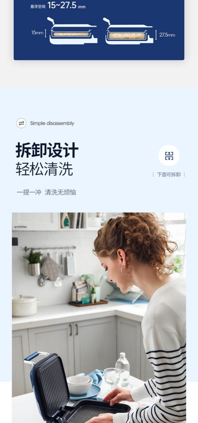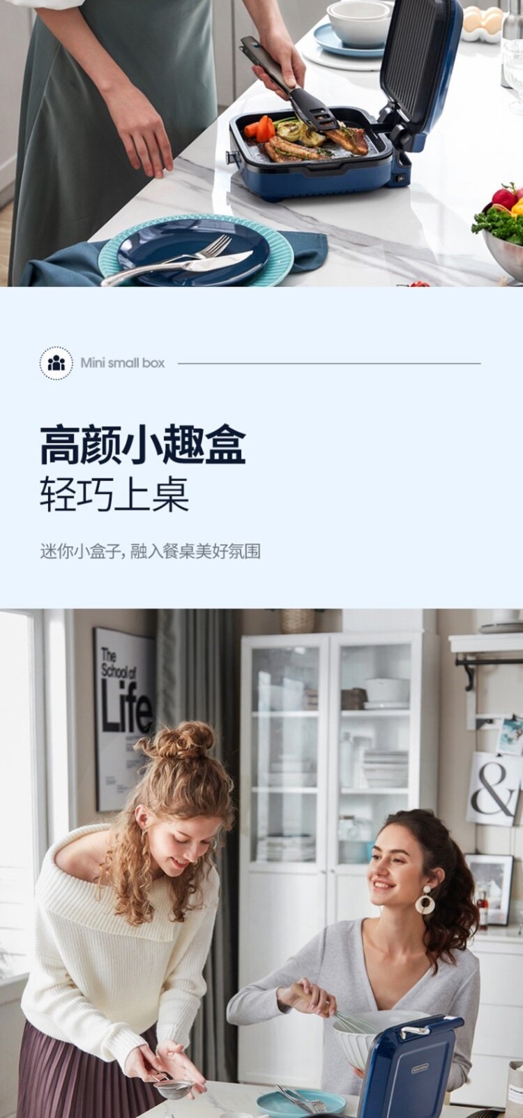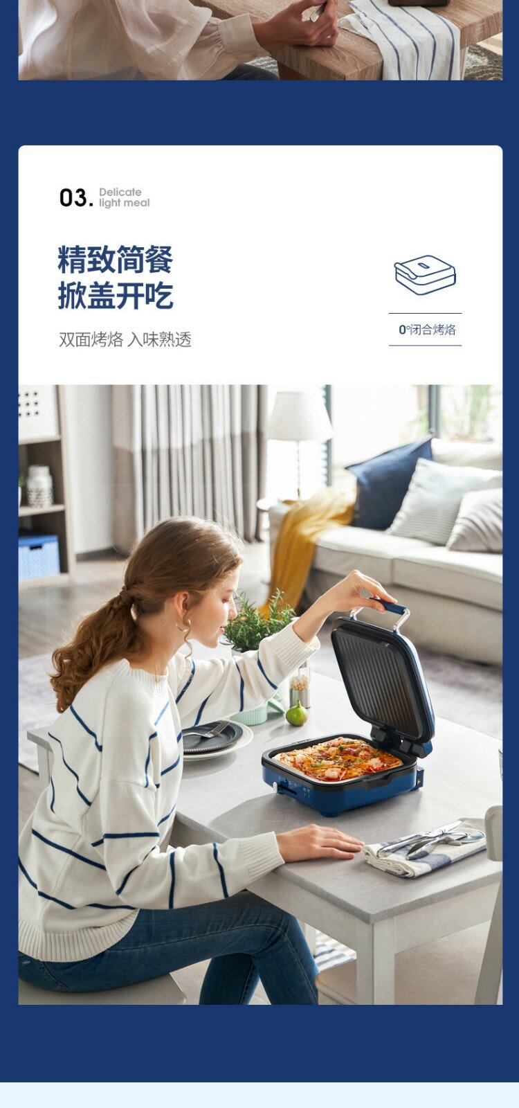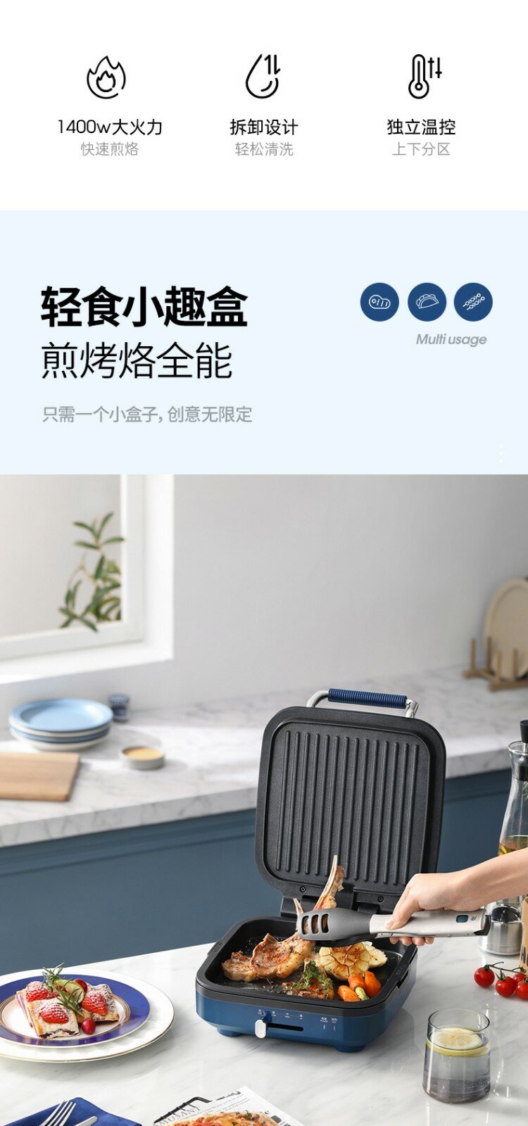 | Дополнительная информация | силиконовая ручка на верхней крышке, конструкция для намотки шнура в нижней части, съемная нижняя форма для выпечки, плавающая конструкция шарнира, независимый контроль температуры верхней и нижней форм для выпечки, верхняя форма для выпечки открывается на 180°, слив для излишков масла, быстрый нагрев |