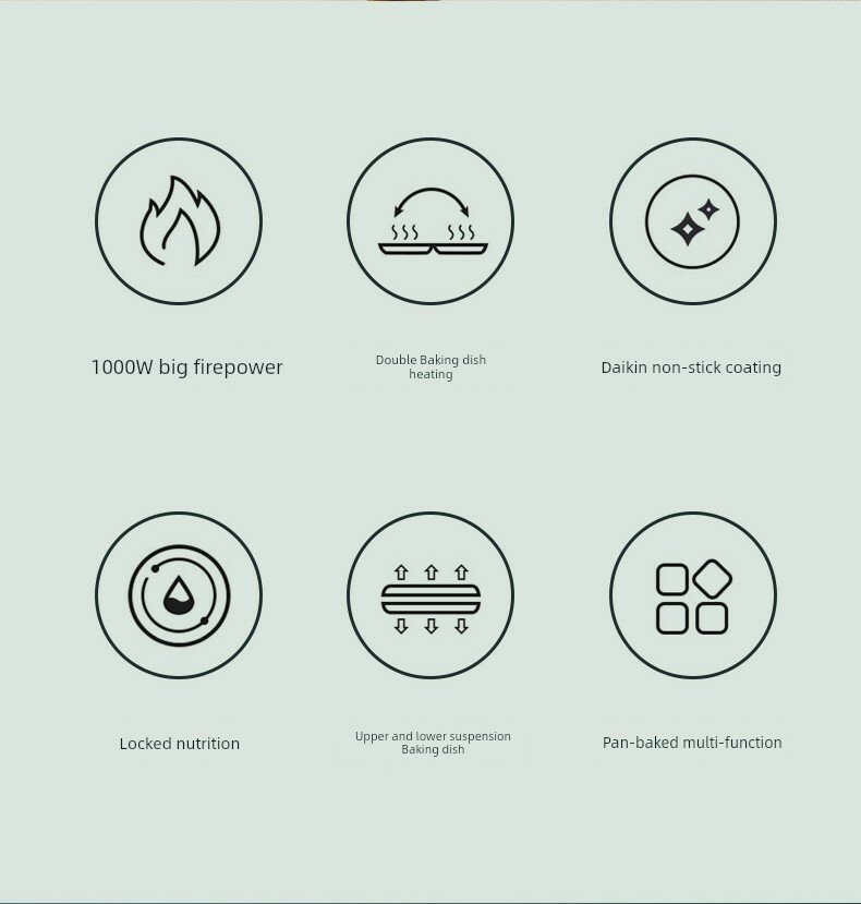 | Дополнительная информация | двусторонний нагрев, антипригарное покрытие Daikin, верхняя и нижняя подвесная форма для выпечки, конструкция маслоотводной канавки, независимый переключатель управления, встроенная ручка/ножка, глубина формы для выпечки 2,7 см |