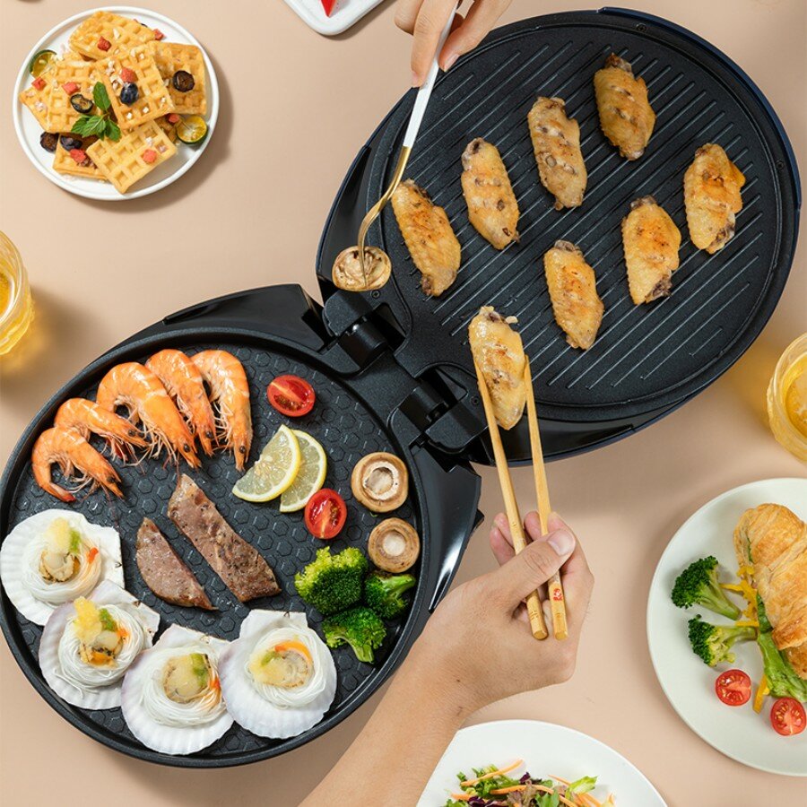 | Дополнительная информация | многофункциональность, открытие и закрытие на 180°, двухсторонний нагрев, верхний и нижний переключатель, большая форма для выпечки 30 см, независимое управление верхней и нижней панелями, конструкция маслоотводной канавки, хранение шнура питания, антипригарное покрытие, ручка с защитой от ожогов |