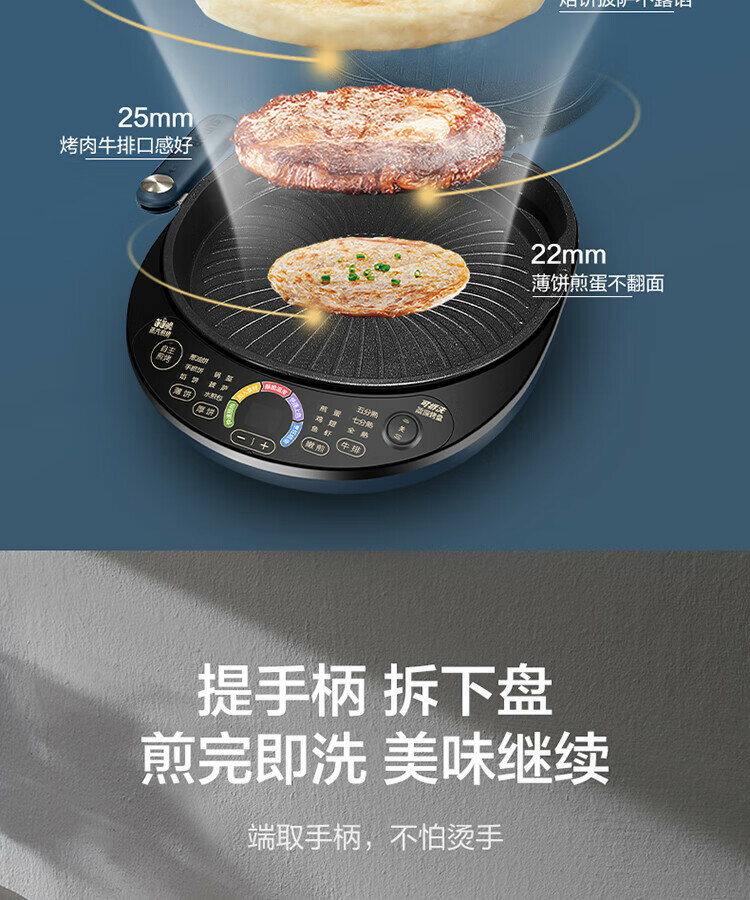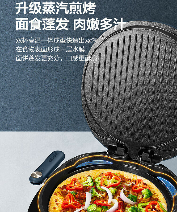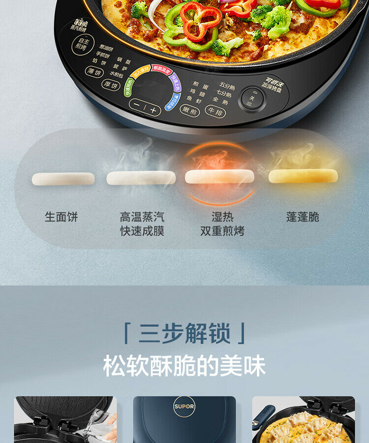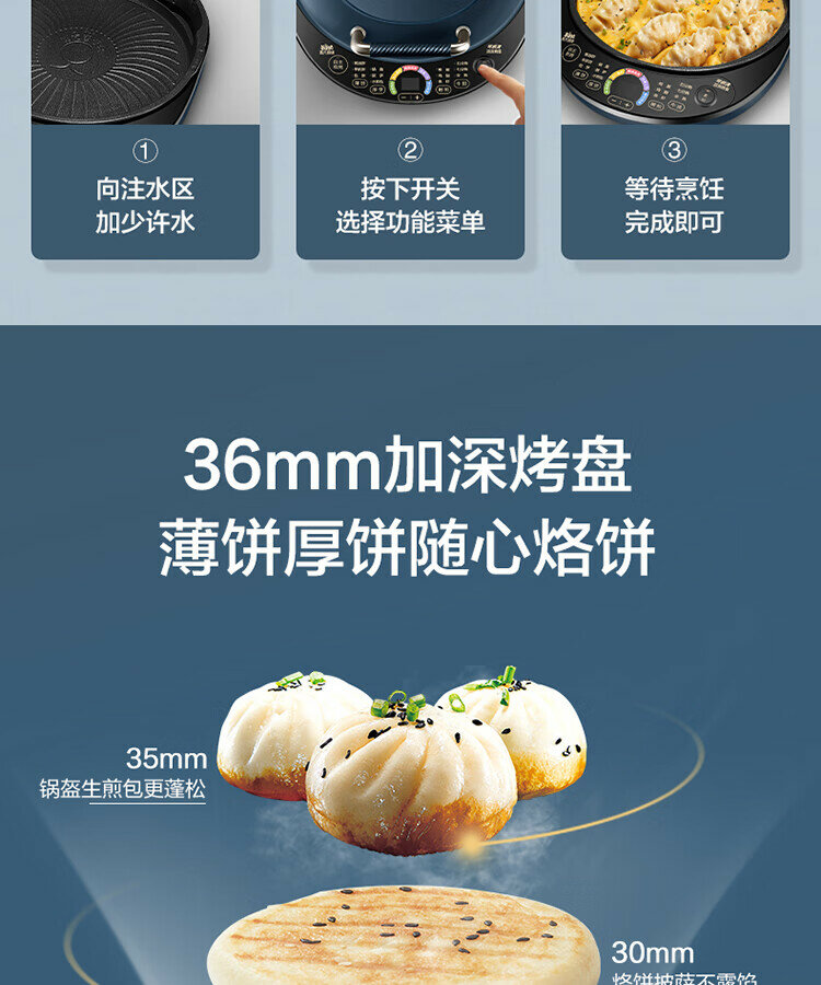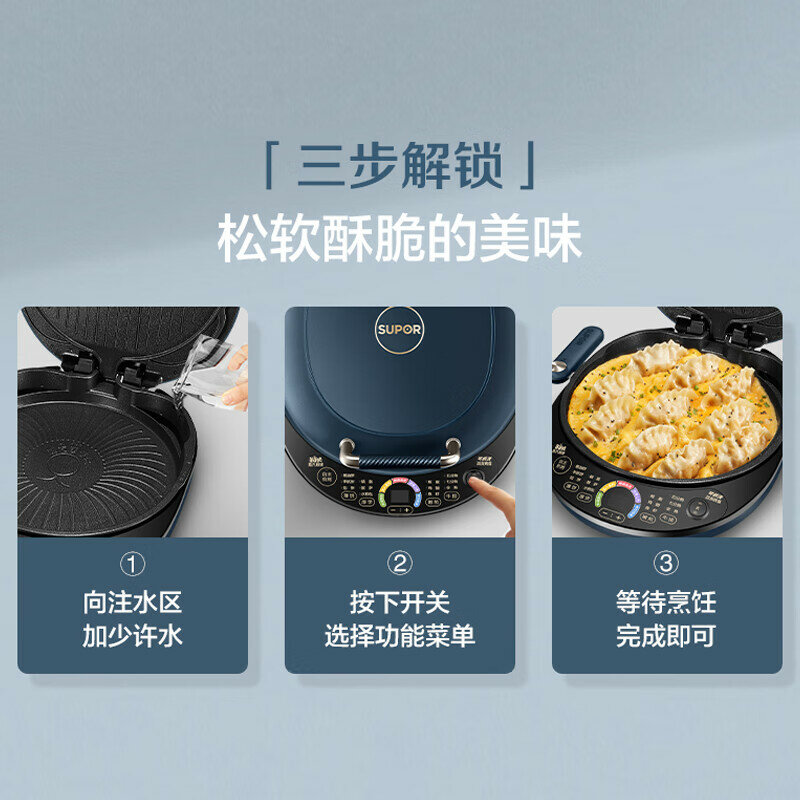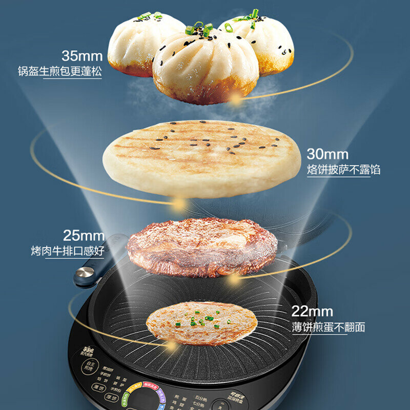 | Дополнительная информация | паровая пластина для придания хрустящей текстуры, глубокая форма для выпечки 36 мм, съемная нижняя панель для легкой очистки, большая форма для выпечки 30 см, высокая мощность 1600 вт для быстрой выпечки, равномерная нагревательная пластина, складная ручка с защитой от ожогов, независимый паровой бокс, конструкция маслоотводной канавки, конструкция нижней обмотки, регулировка 0°/105°/180°, подходит для закрытого состояния, верхняя пластина без огня, нагрев верхней и нижней пластин, управление ручкой, антипригарная сковорода, 10 функций приготовления |