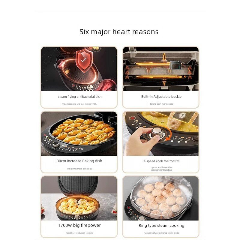| Дополнительная информация | двусторонний нагрев, конструкция подвесной формы для выпечки, жарочная машина, механический режим работы, мощность 1700 Вт, калибр противня 30 см, глубина противня 3 см, несъемная пластина, для жарки, для жарки других продуктов, для жарки блинов, гарантия 12 месяцев, антибактериальный противень для жарки на пару, встроенная регулируемая пряжка, антибактериальный эффект 99,9%, увеличенный противень 30 см, 5-скоростной термостат с ручкой, большая огневая мощь 1700 Вт, приготовление на пару кольцевого типа, быстрая теплопроводность |
