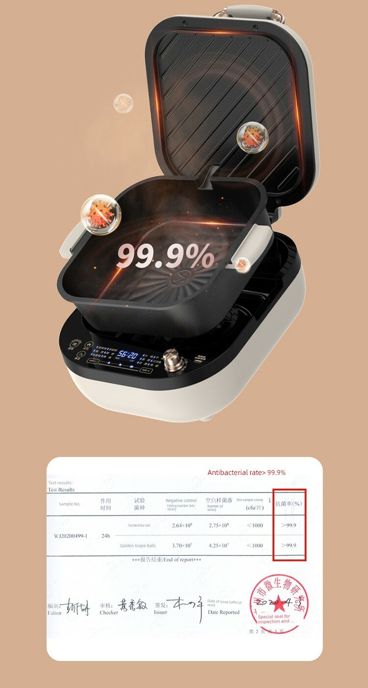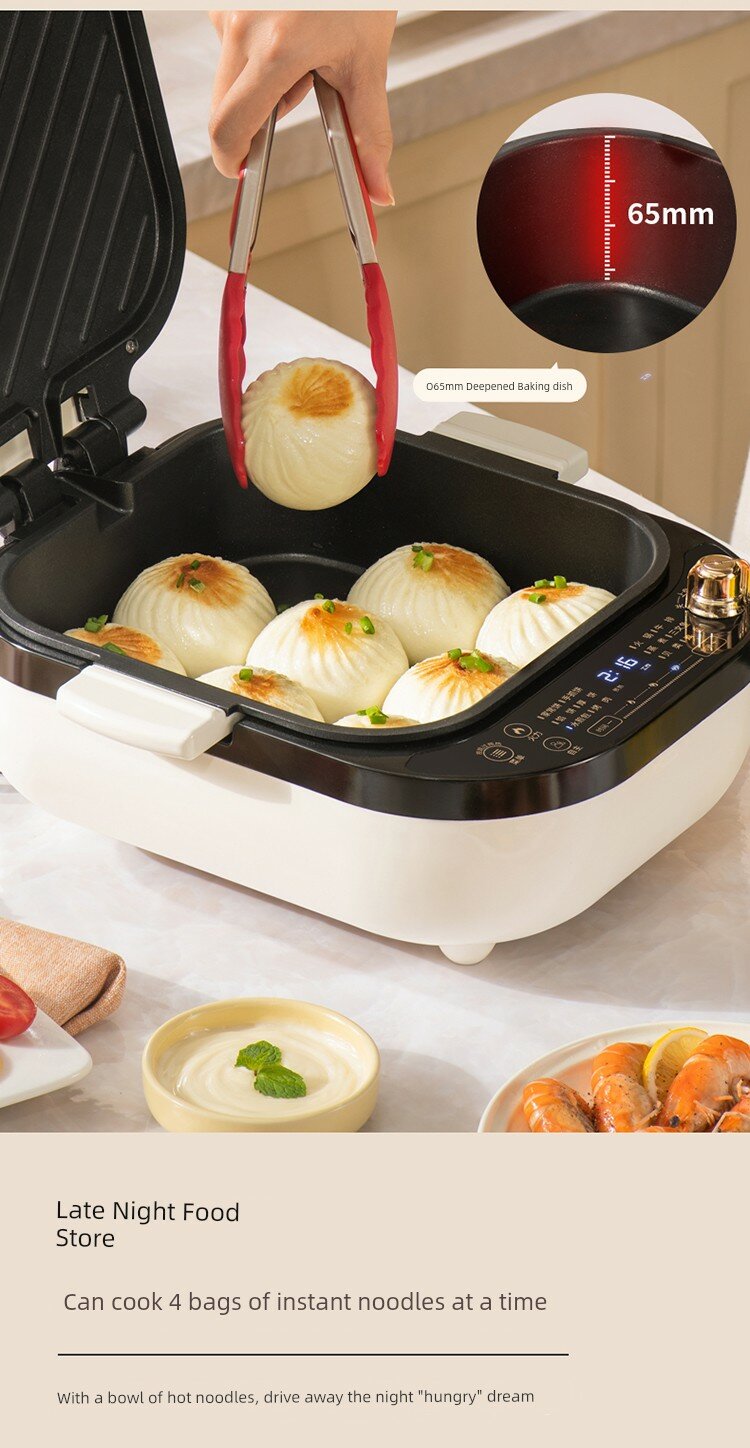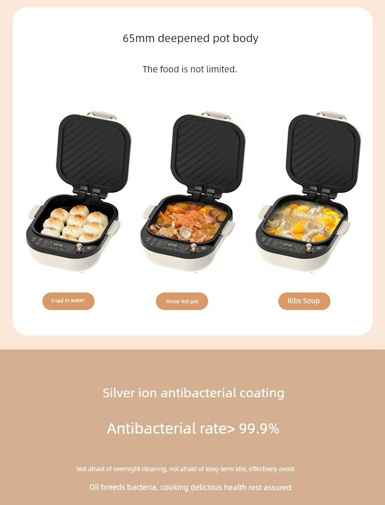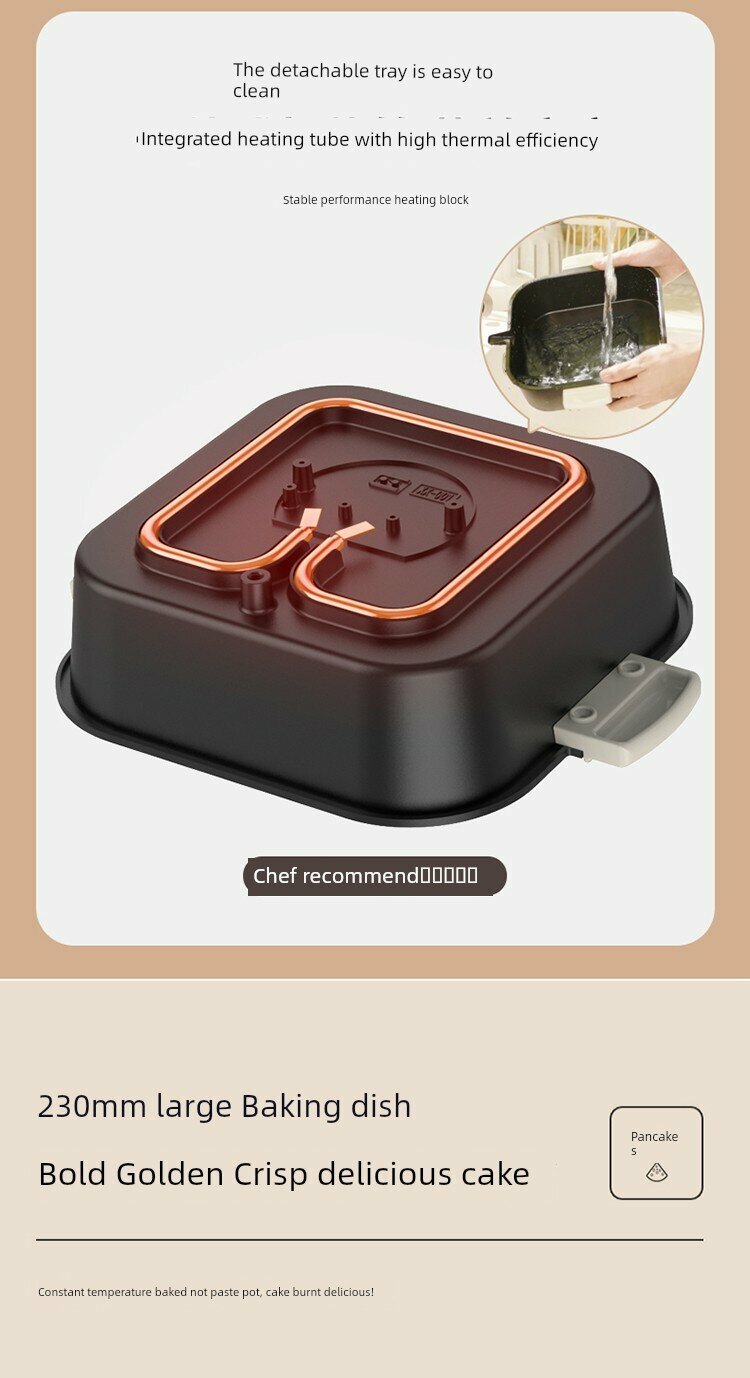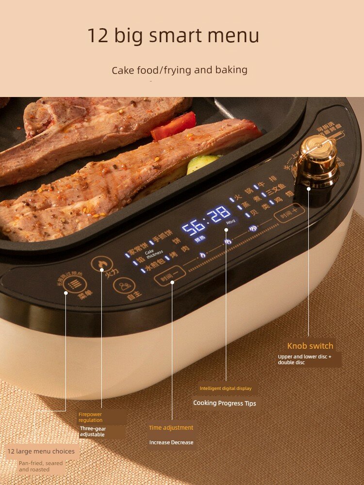 | Дополнительная информация | двусторонний нагрев, углубленная форма для выпечки 65 мм, большая пластина 23 см, 12 интеллектуальных меню, поворотный переключатель, интеллектуальный цифровой дисплей, регулировка мощности огня в трех режимах, регулировка времени, плоское выравнивание обеих сторон на 180°, антибактериальная форма для выпечки с ионами серебра, съемная нижняя пластина, равномерный нагрев 1500 Вт, антипригарное покрытие |