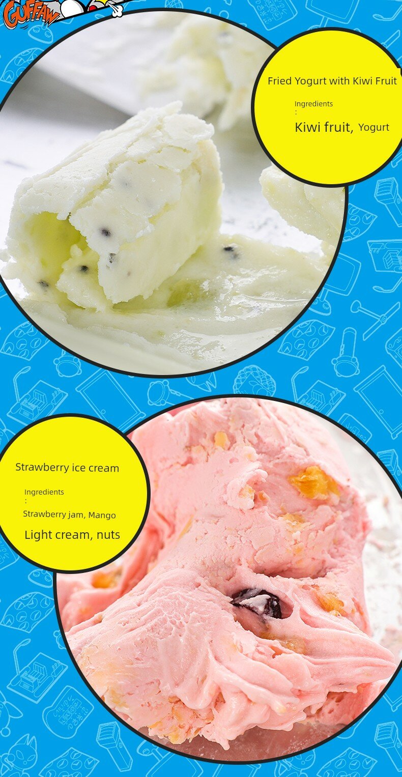 | Дополнительная информация | включает лопатку для жареного льда, миску для мороженого, ложку для мороженого, порошок для мороженого, мультяшную форму*6, крышку для сохранения свежести, физическое холодное хранилище, быстрая скорость охлаждения, экологически чистый хладагент, система циркуляции холодного хранения с высокой точкой замерзания, можно мыть по всему телу, удобное ополаскивание, легко чистить после еды, рекомендуемая температура ниже -18° |