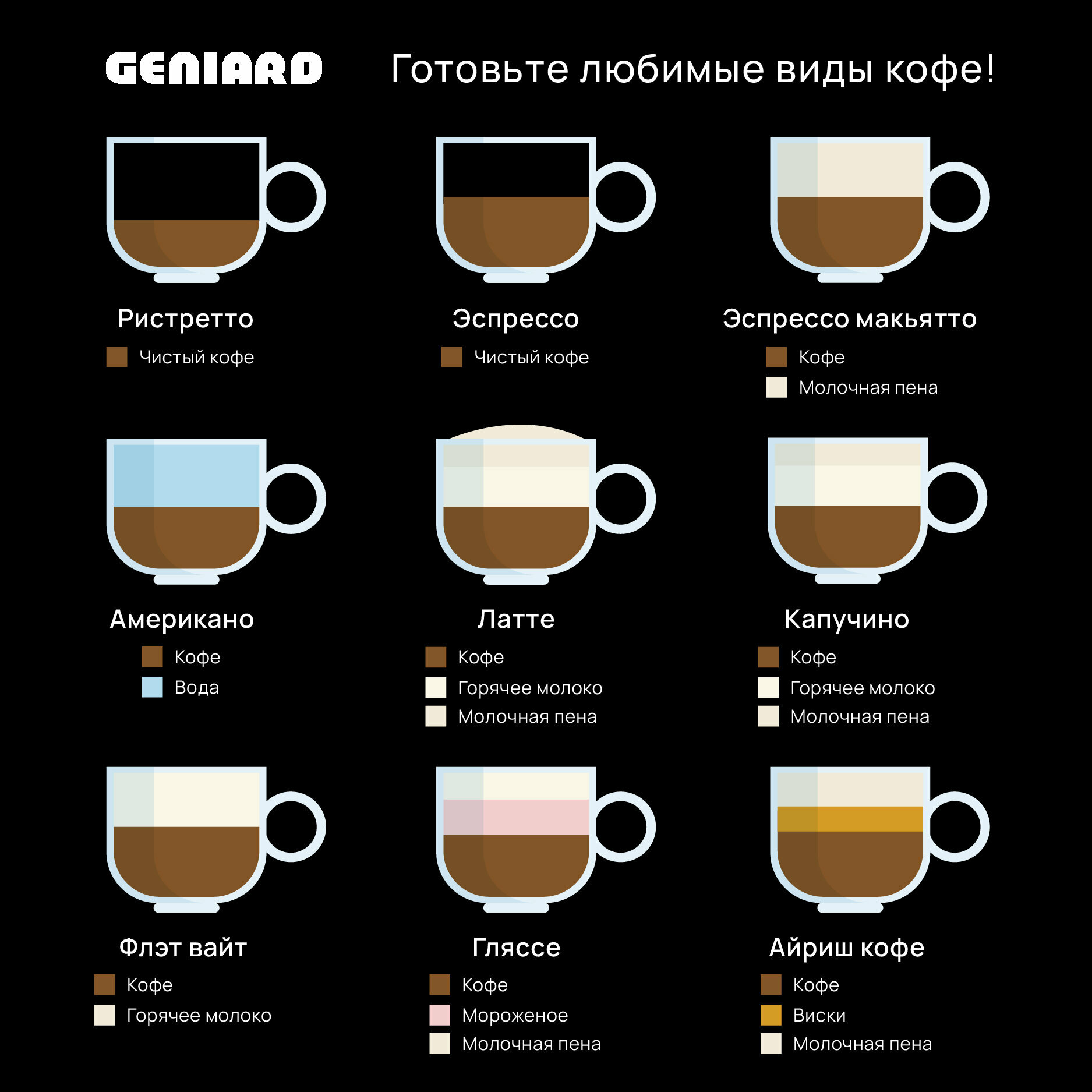 | Тип напитка | капучино / латте / ристретто / флэт уайт / эспрессо / Моккачино / Молочная пена |