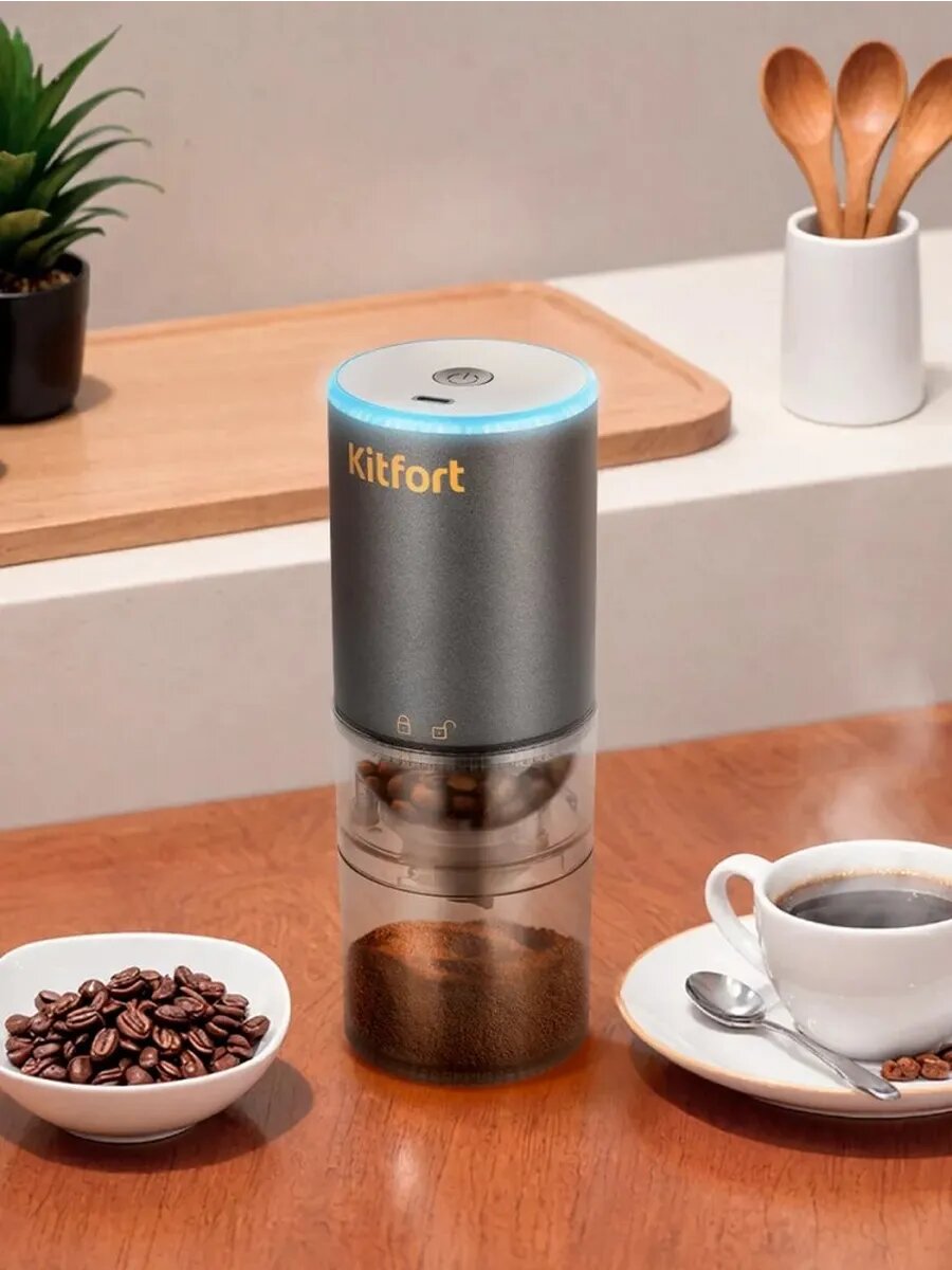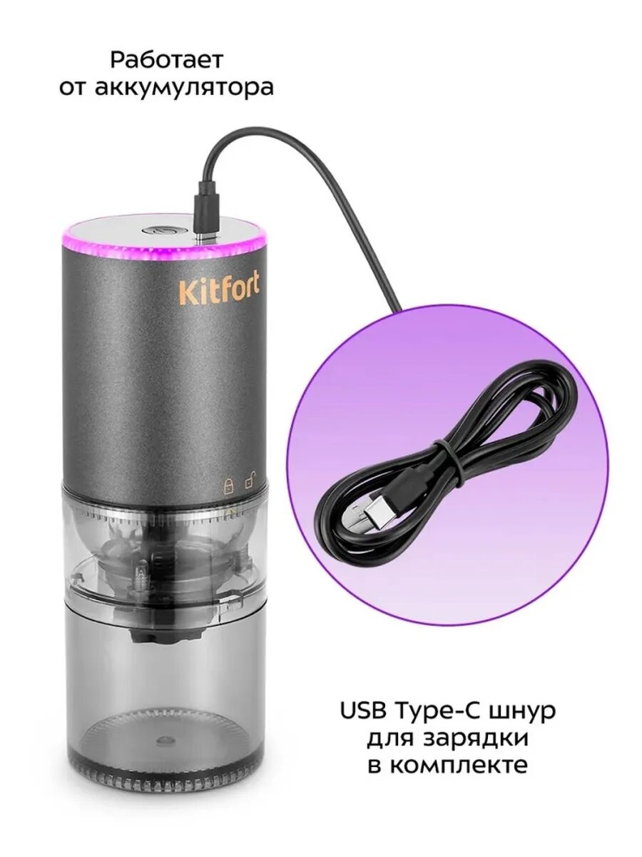 Кофемолка Kitfort КТ-7484, беспроводная, жерновая, мощность 13Вт, с регулировкой помола, серая интересное: