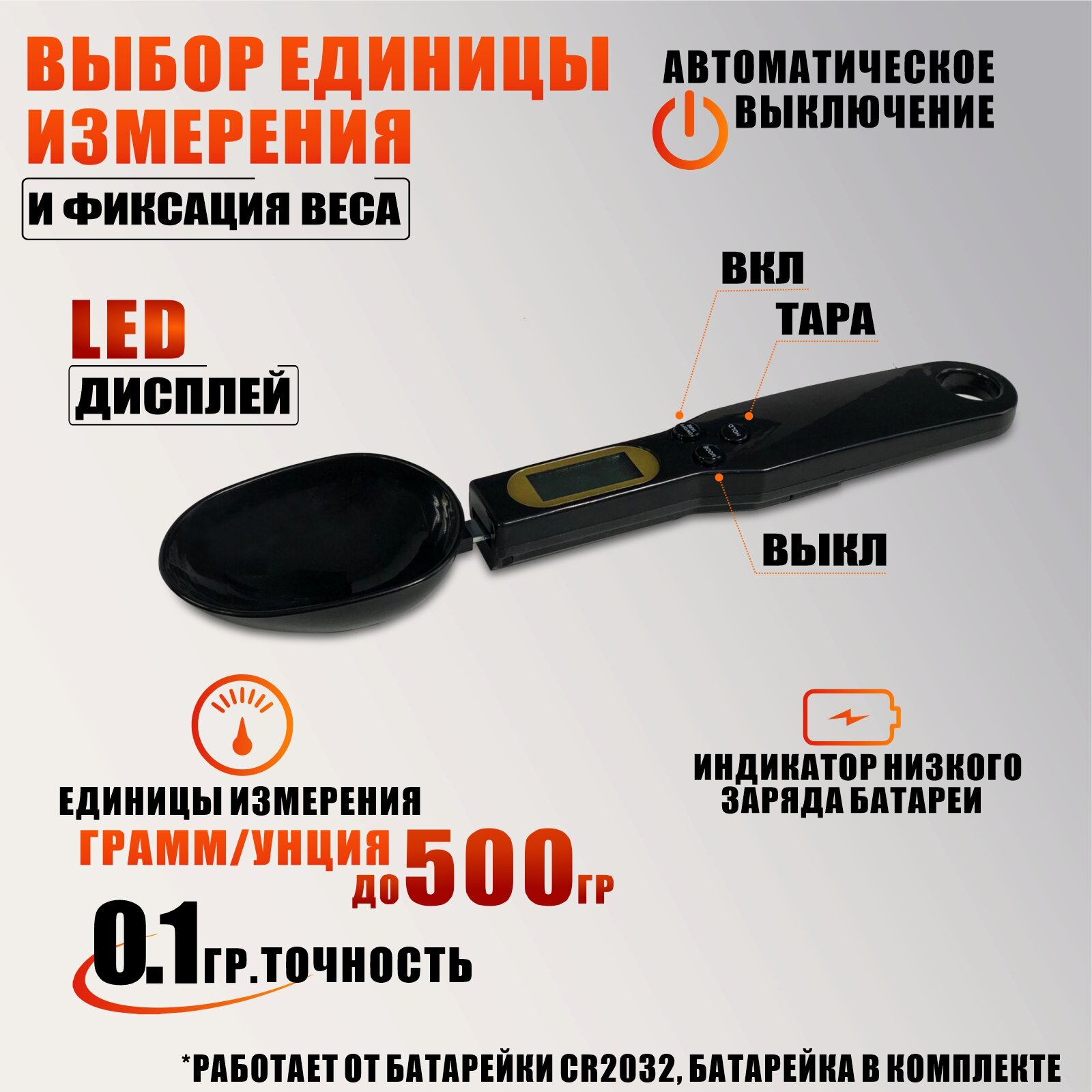 | Дополнительная информация | Кухонные электронные весы ложка подходят также для мелких сыпучих продуктов (крупы, чай, травы). Весы для подсчета калорий станут незаменимым помощником для тех, кто следит за питанием для соблюдения баланса в рационе. |