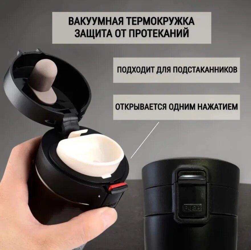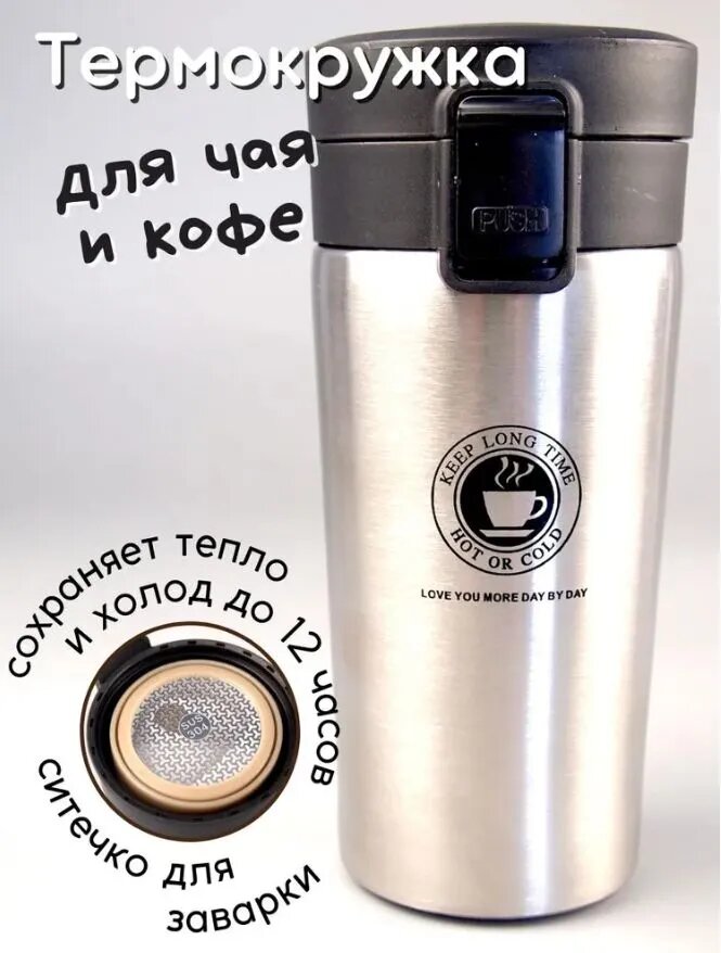 | Дополнительная информация | Колба этой термокружки изготовлена из нержавеющей стали. Вакуум между корпусом и колбой позволяет содержимому не терять свою температуру в течение 6-12 часов. Если вы любите пить в дороге горячий чай или кофе, но вам не нравится останавливаться и искать где можно купить, то эта находка для вас. С ней вы сэкономите не только время и деньги, но и получите возможность насладиться любимым напитком в любое удобное для вас время. А сильный дизайн самой кружки будет радовать вас каждый раз, когда вы будете держать ее в руках. Долго сохраняет температуру Можно переносить любые напитки Не теряет свои функции со временем Крышка плотно фиксируется, содержимое не будет выливаться Герметичен при перевозке Стильный внешний вид Легок в использовании Обьем: 380мл. Количество часов удержания тепла или холода: 6-12 часов. Материал: Нержавеющая сталь, полипропилен Размер: высота: 17 см., диаметр крышки 8 см., диаметр основания 6,5 см. |