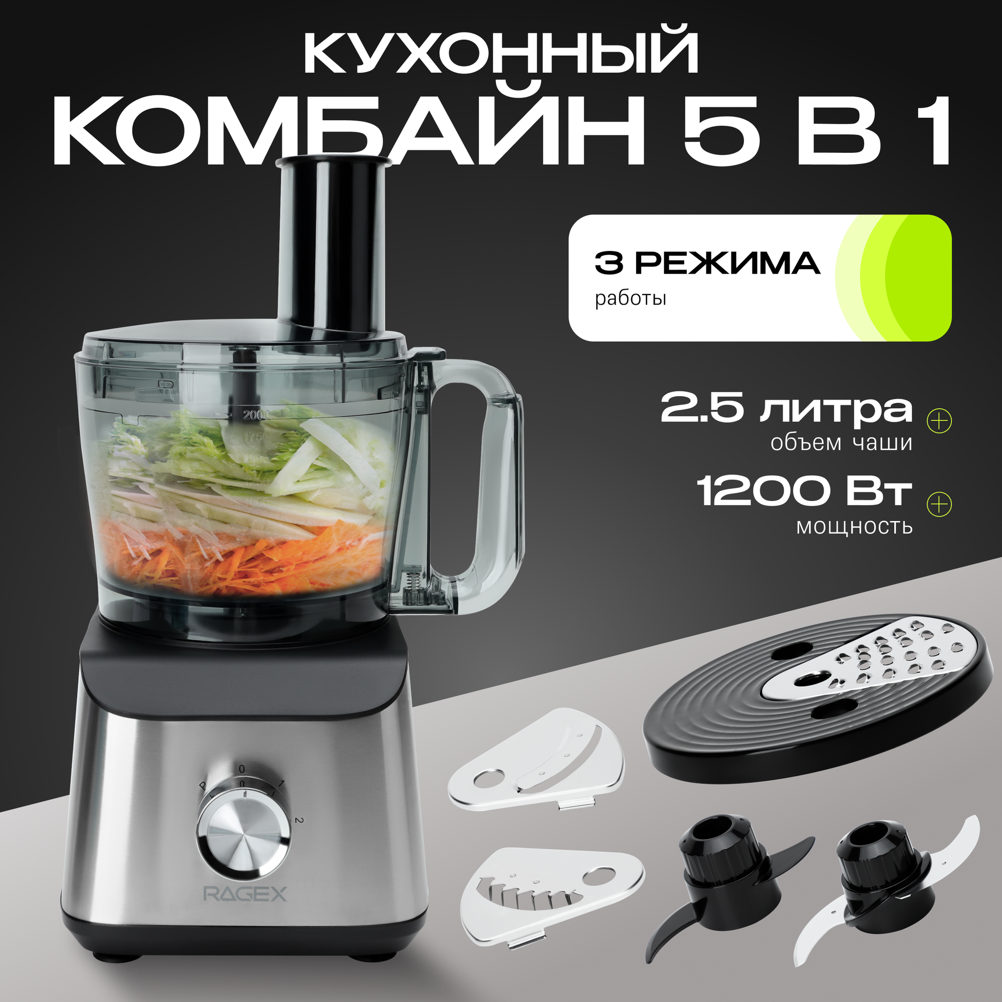 Кухонный комбайн 5 в 1, объем 2.5 литра, 2 скорости, 1200 Вт, серебристый интересное: