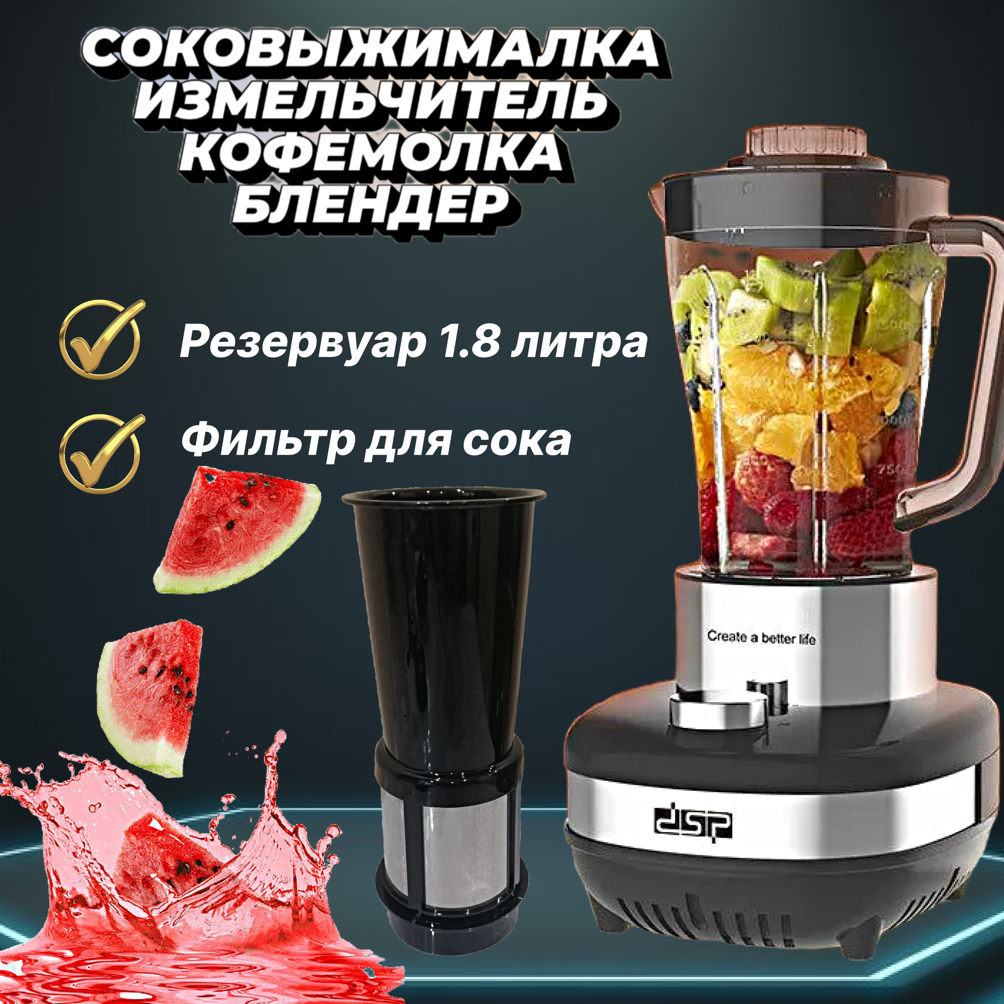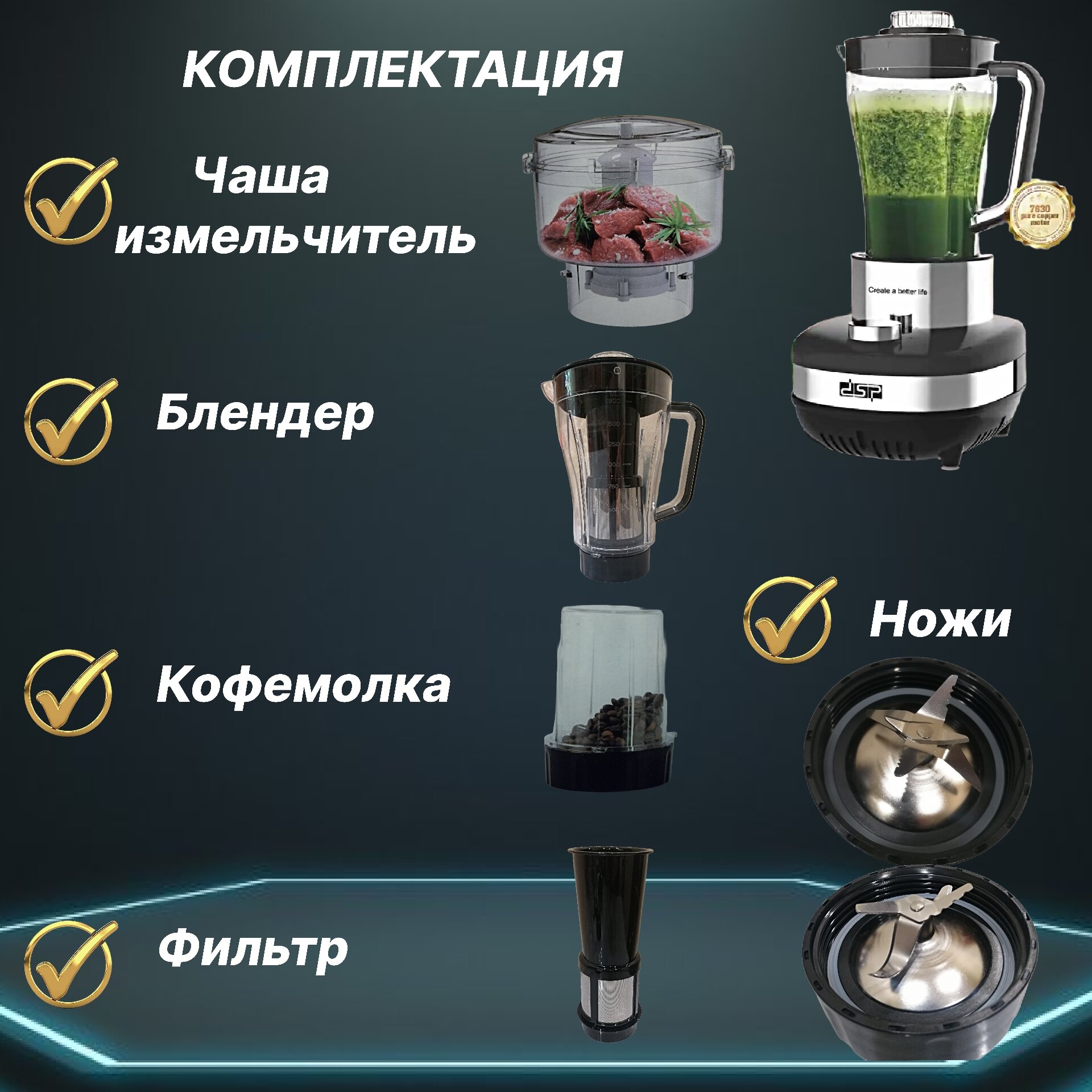 | Подробная комплектация | Блендер измельчитель 1.8 литр; кофемолка 450мл; соковыжималка фильтр; чаша измельчитель 650мл |
