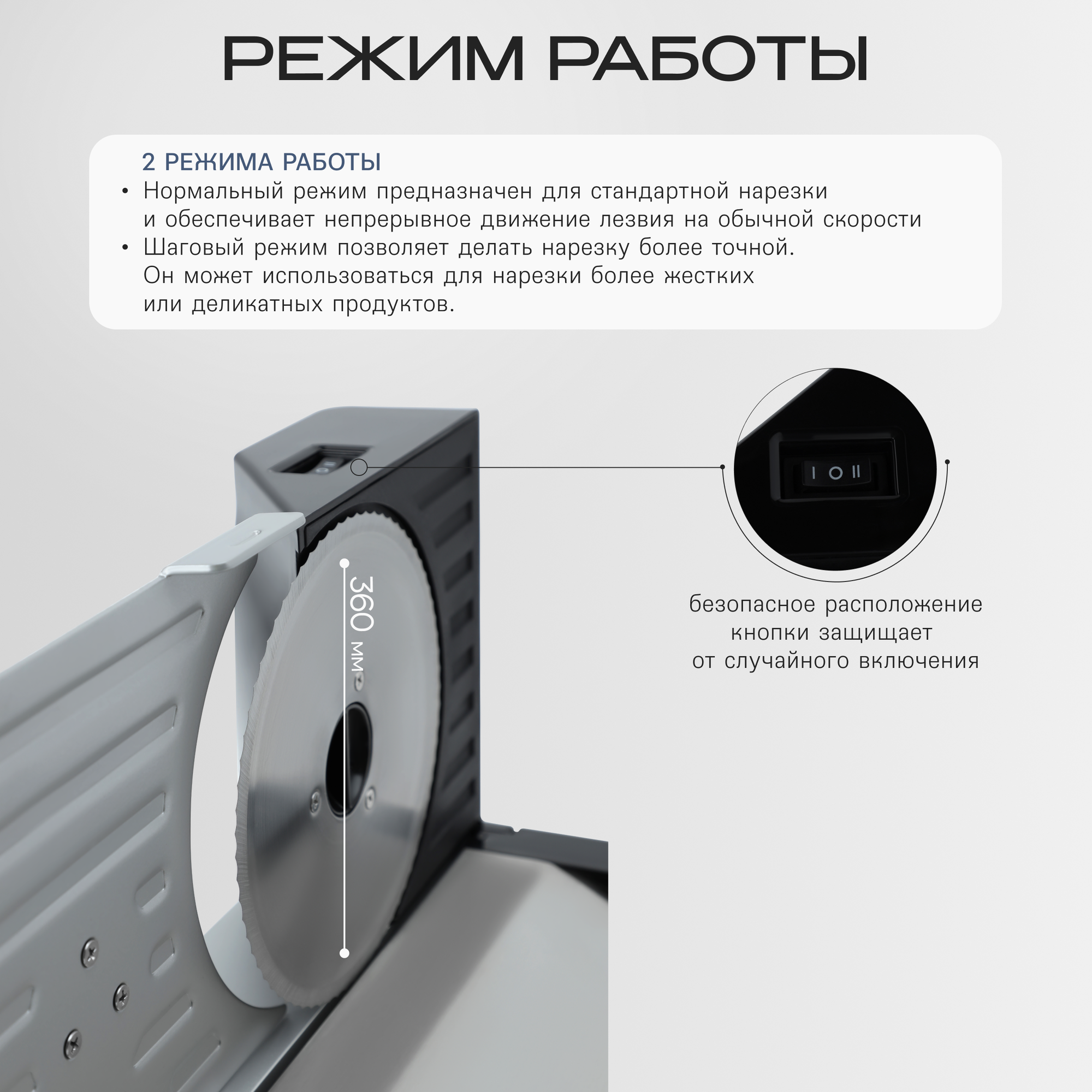 | Дополнительная информация | Особенности: 1-ая скорость: нормальная работа; 2-ая скорость: шаговый режим; Назначение: замороженное мясо без костей, колбаса, картофель, фрукты, ломтики хлеба и др.; Съемный стол для подачи; Удобное хранение кабеля; Плавная регулировка толщины нарезки. |