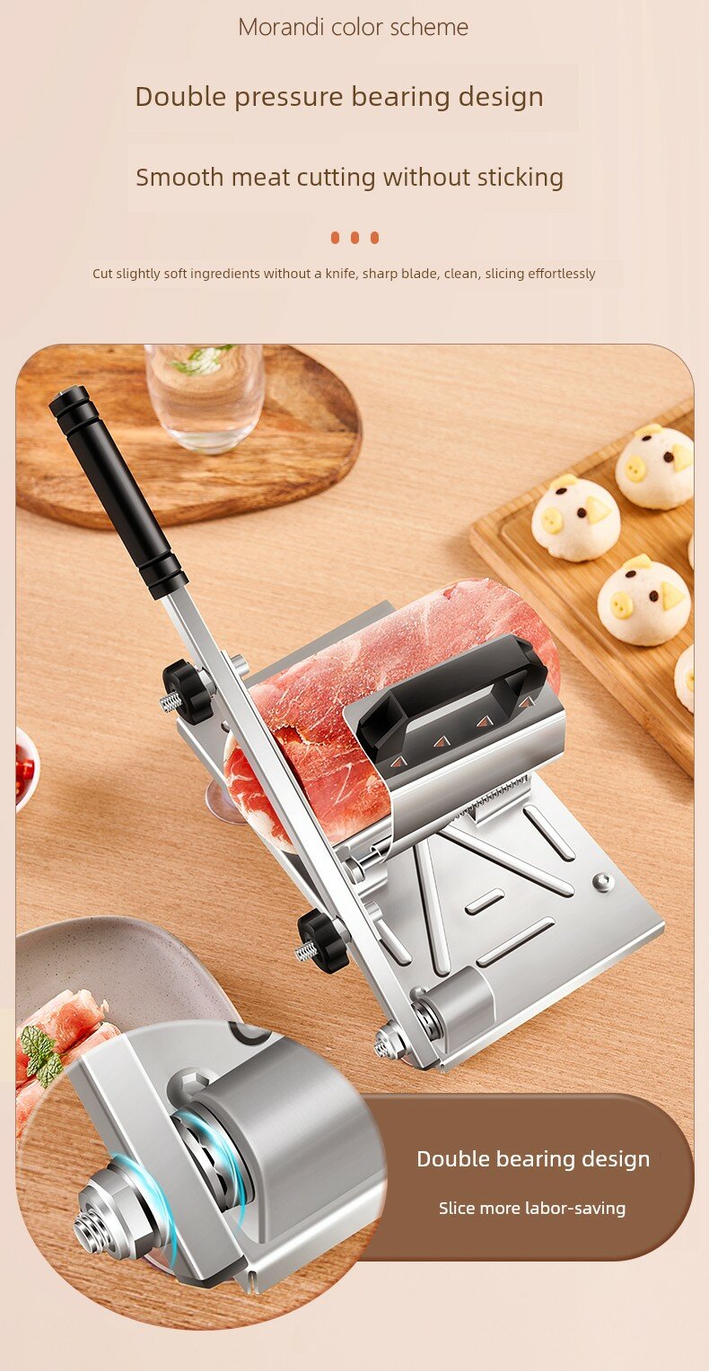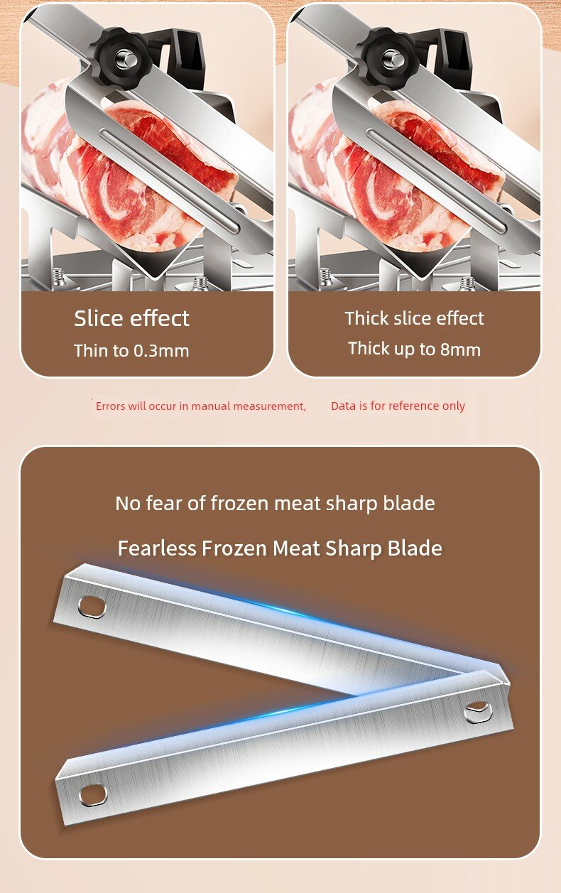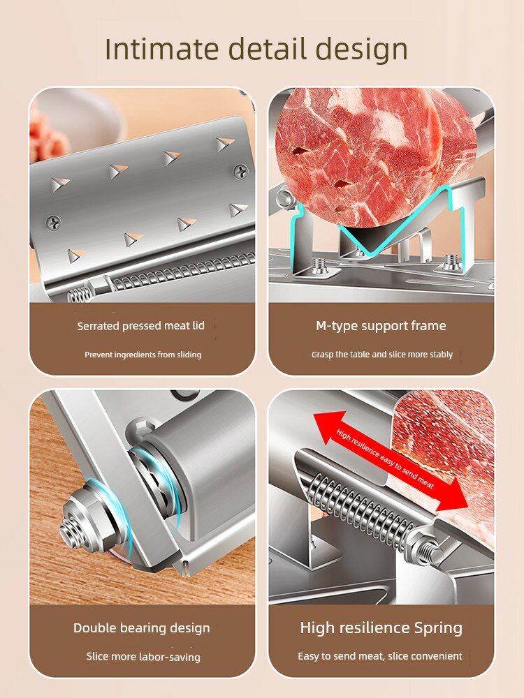 | Дополнительная информация | пружинная автоматическая подача мяса, регулируемая толщина нарезки, корпус из нержавеющей стали 430, регулировка толщины лезвия 0.3-8 мм |