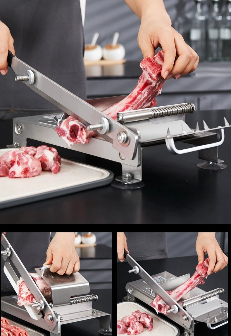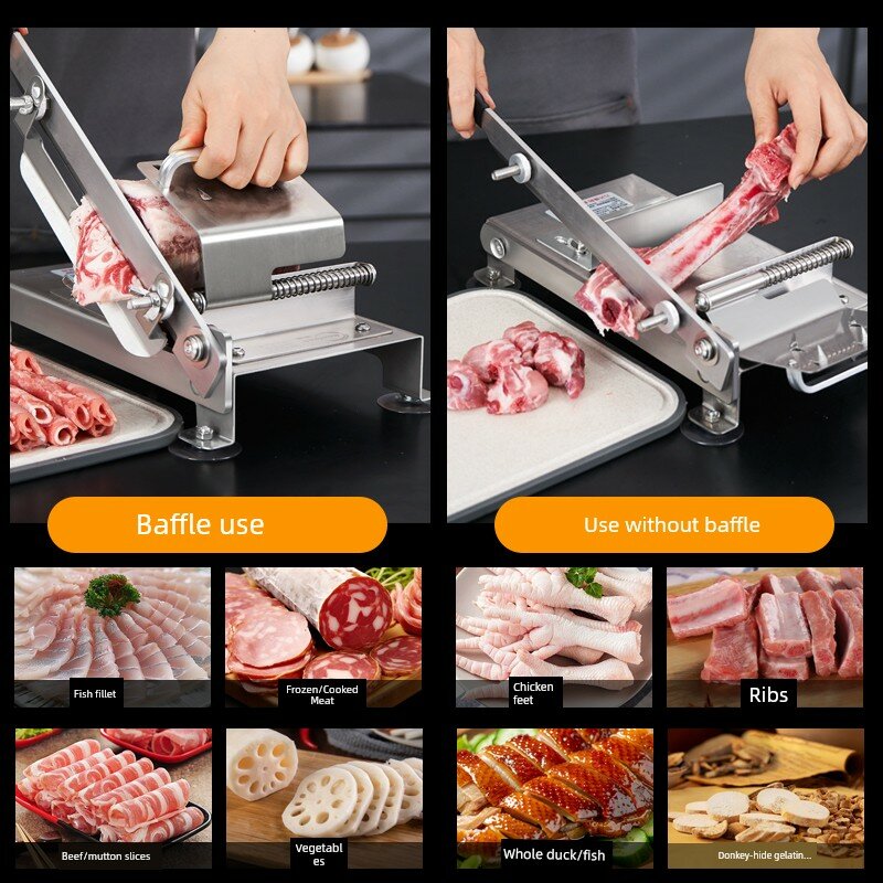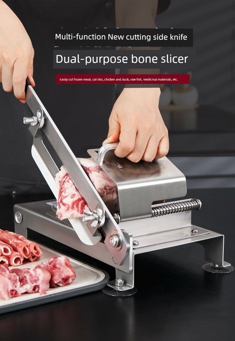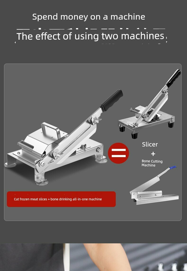 | Дополнительные функции | Регулируемая толщина 0.5-15 мм, резка костей, автоматическая подача мяса |