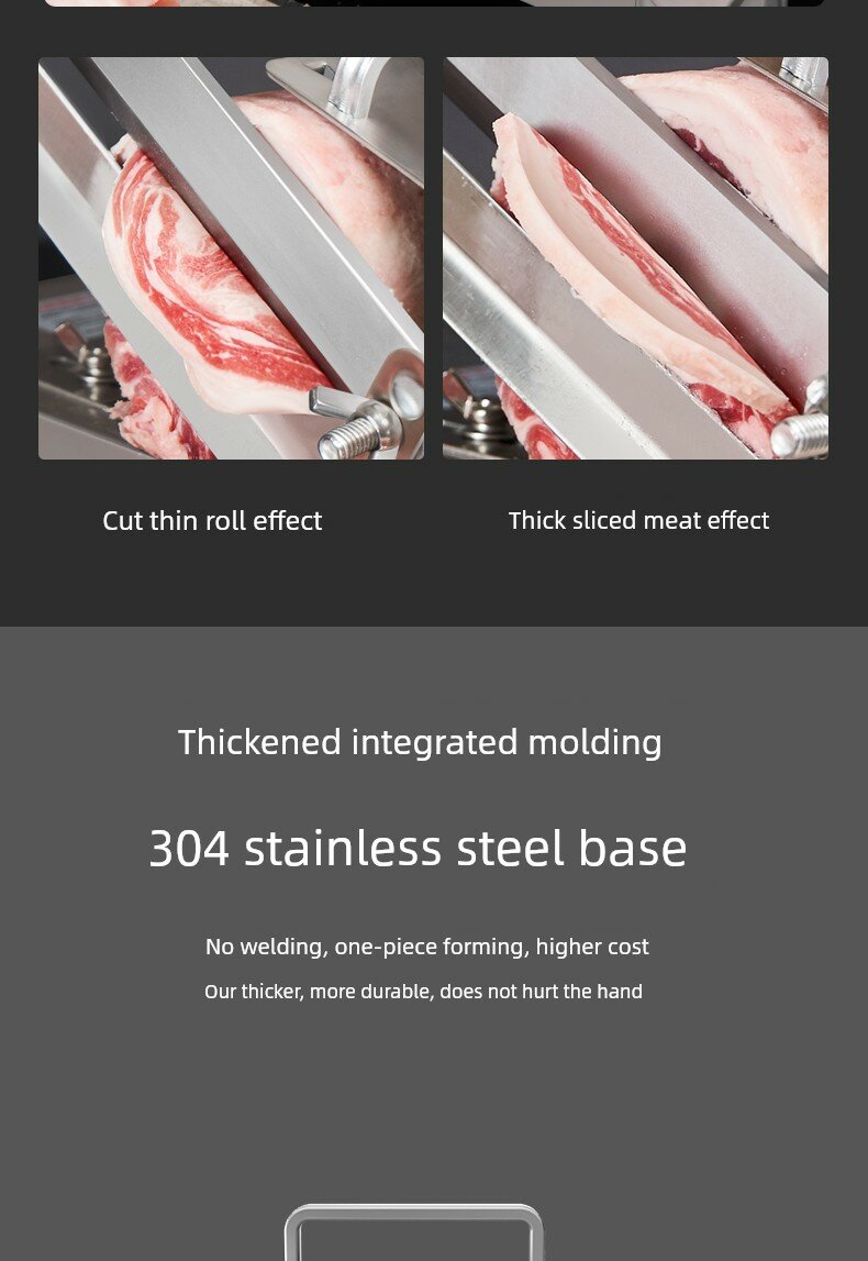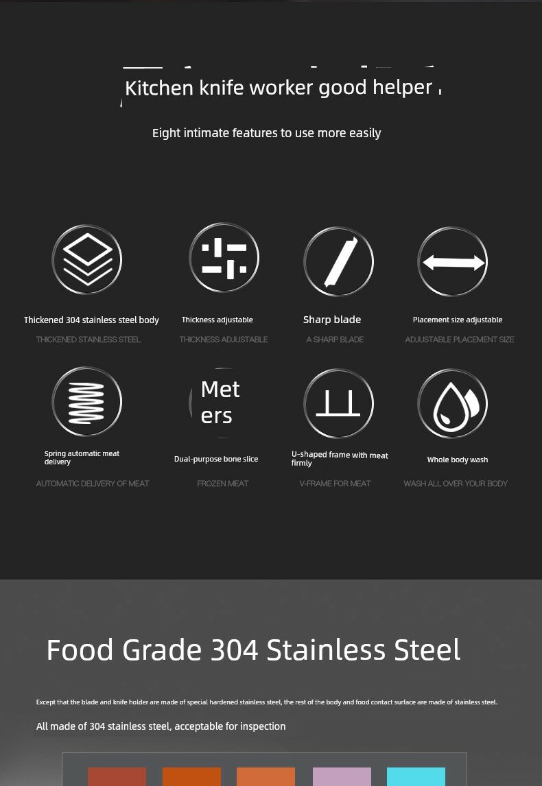 | Дополнительная информация | 304 нержавеющая сталь, регулируемая толщина 0.5-15 мм, двусторонний слайсер для костей, автоматическая подача мяса, u-образная рама с мясом, мойка всего тела, пищевая нержавеющая сталь 304, специальная ручка из закаленной нержавеющей стали, подходит для нарезки крупных ингредиентов, материал 3cr13, расстояние нарезки рулета из баранины: диаметр 150 мм, расстояние нарезки говяжьего кирпича: диаметр 180 мм, скорость нарезки: 60 ломтиков/минуту |