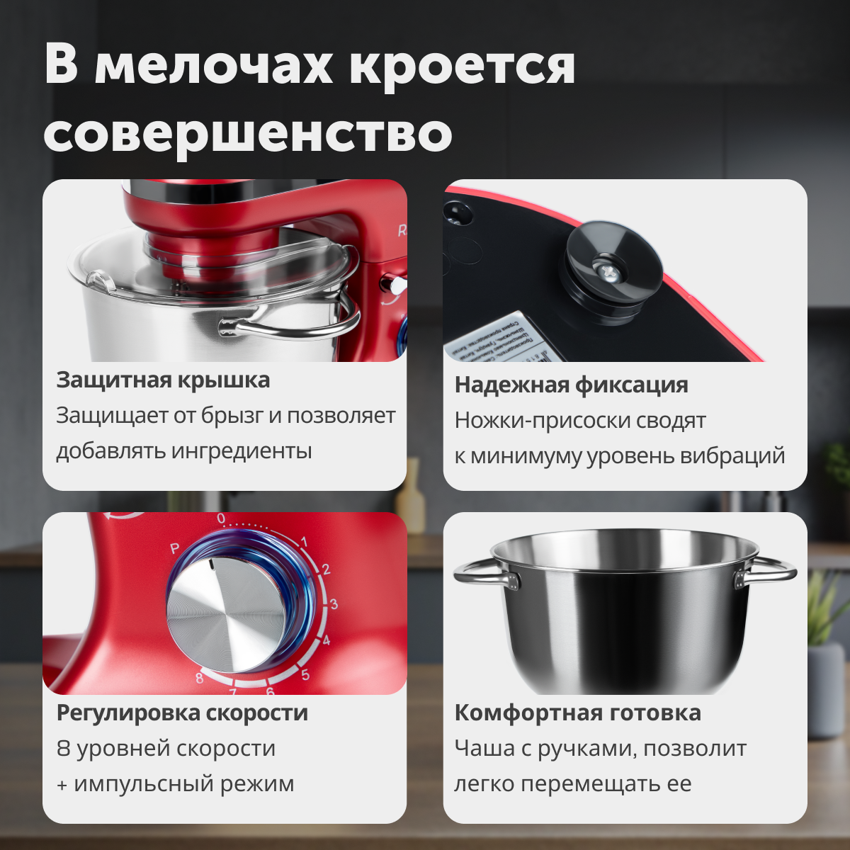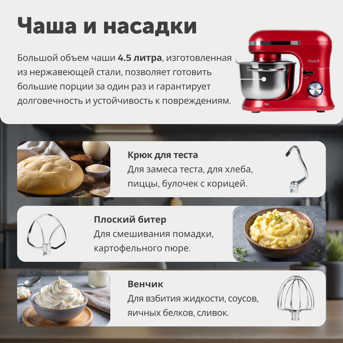 Планетарный миксер 3 в 1, объем чаши 4.5 литра с двумя ручками, мощность 1000 Вт, красный интересное: