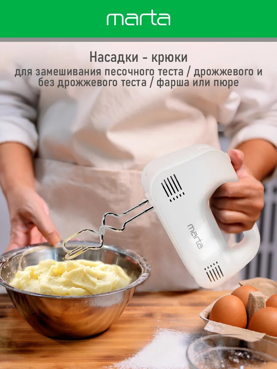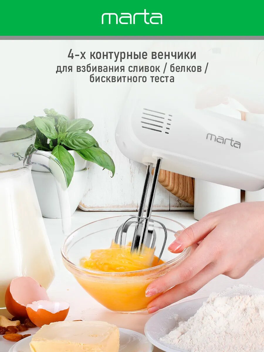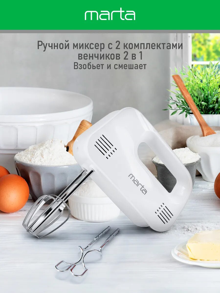 Миксер ручной MARTA MT-MX1524A, 500Вт, 3 скорости, пластик, белый интересное: