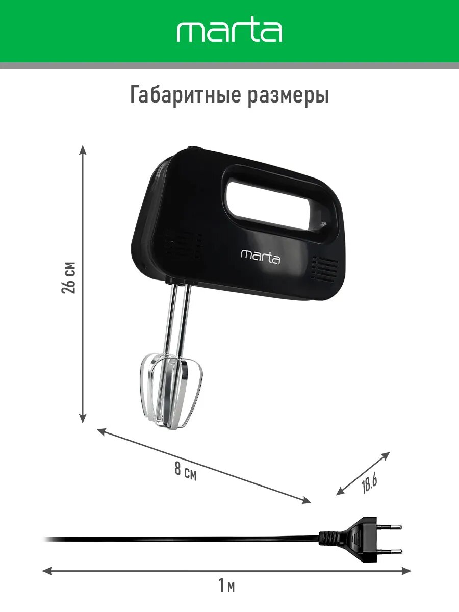 Миксер MARTA MT-MX1524A, мощность 500Вт, 3 скорости, ручной, черный интересное: