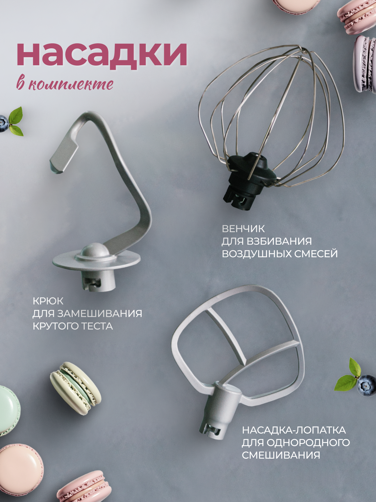 | Насадки | венчик для взбивания / крючки для замешивания теста / лопатка |