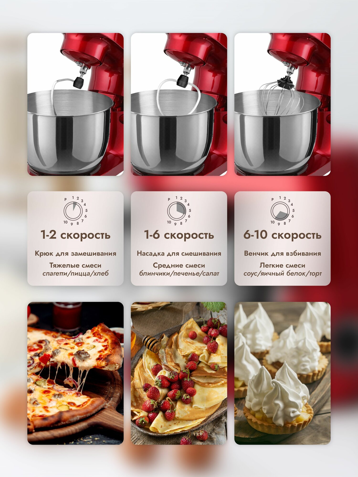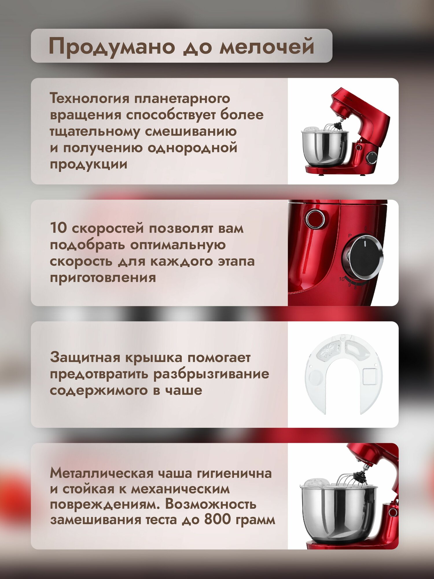| Дополнительная информация | Комплектация: планетарный миксер, чаша миксера, насадка-крюк, насадка-венчик, насадка для смешивания, крышка для чаши, инструкция |