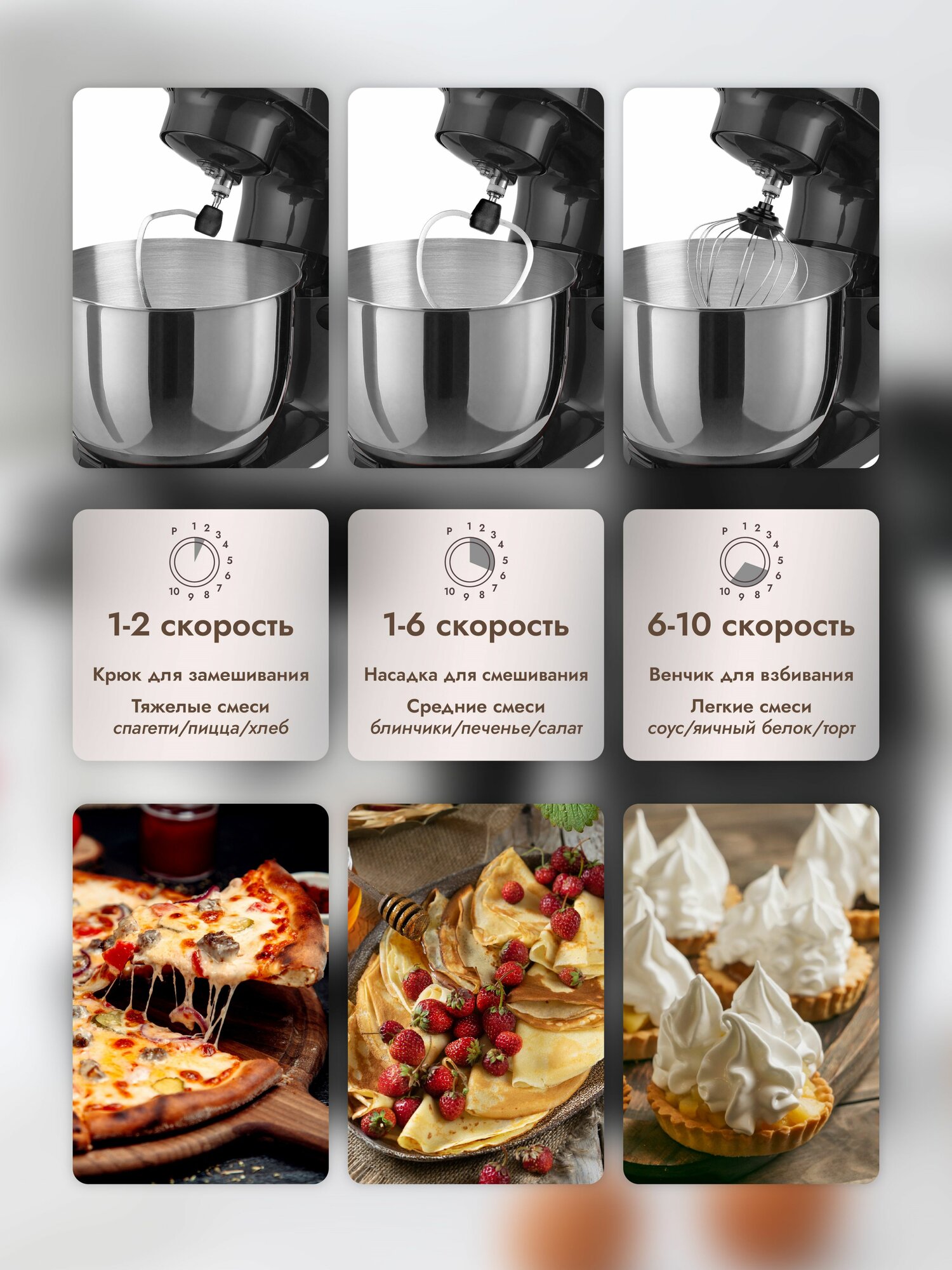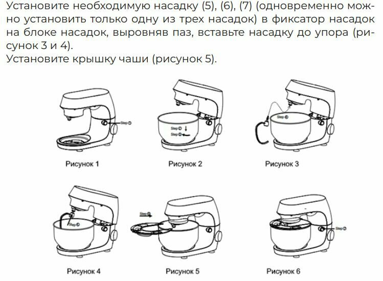 | Дополнительная информация | Комплектация: планетарный миксер, чаша миксера, насадка-крюк, насадка-венчик, насадка для смешивания, крышка для чаши, инструкция |