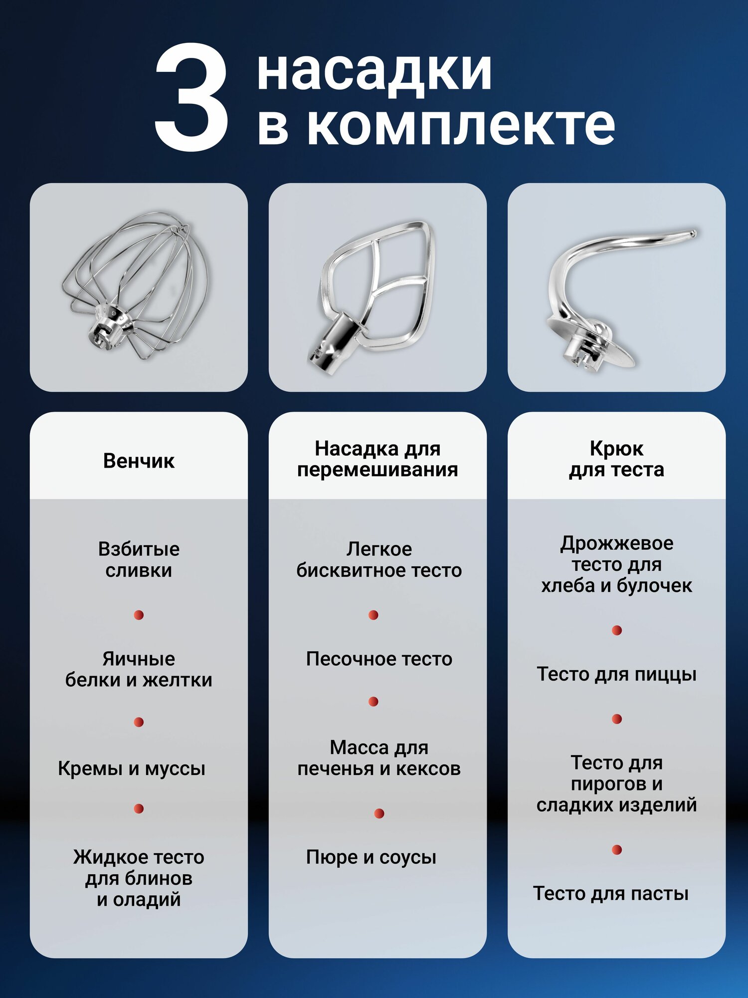 | Насадки | венчик для взбивания / крючки для замешивания теста |