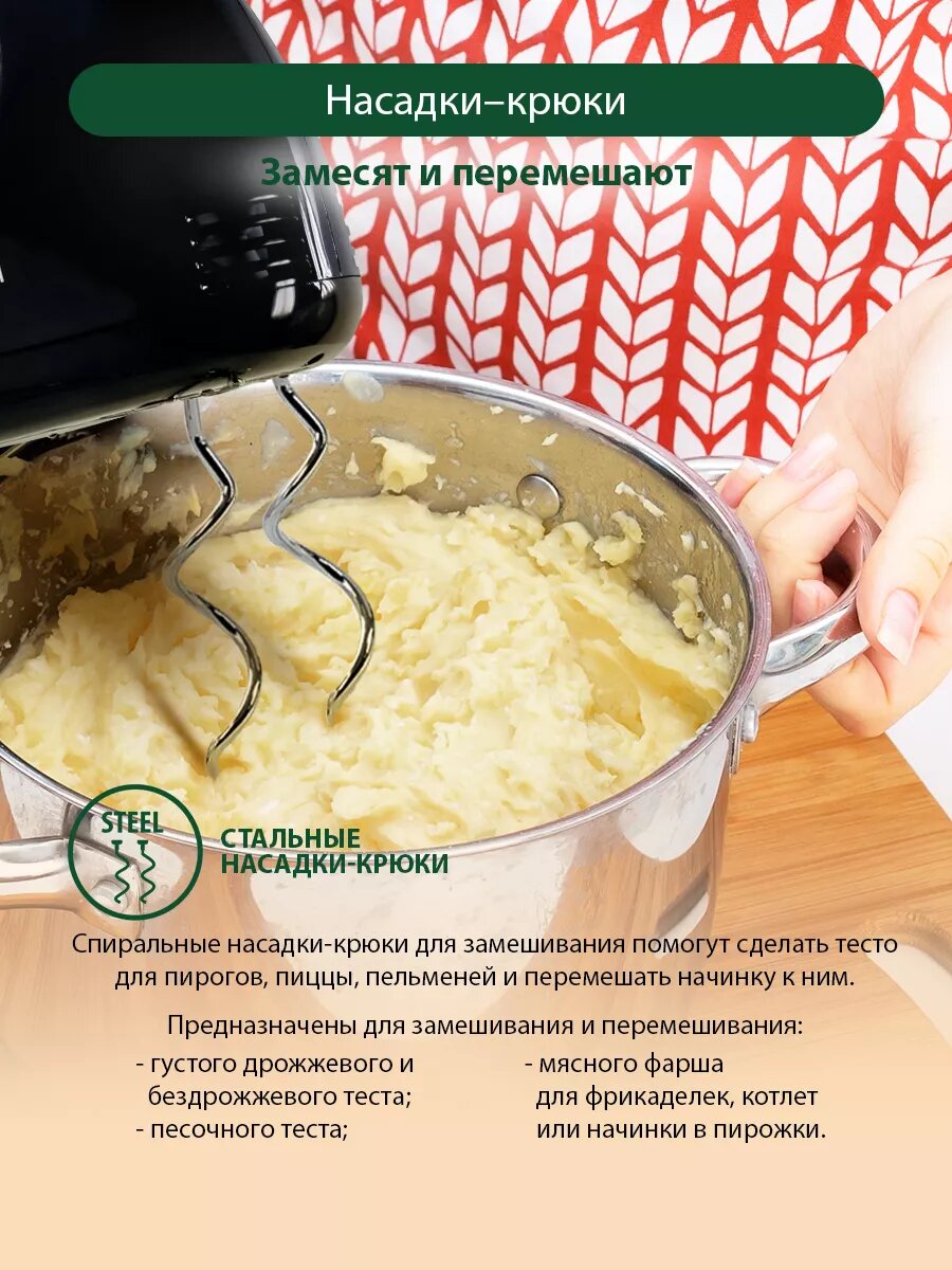 | Насадки | венчик для взбивания / крючки для замешивания теста |