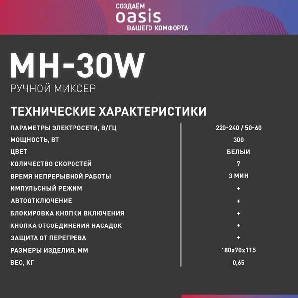 Купить Миксер ручной OASIS MH-30W, белый, 300 Вт, 7 скоростей, заводская, полная