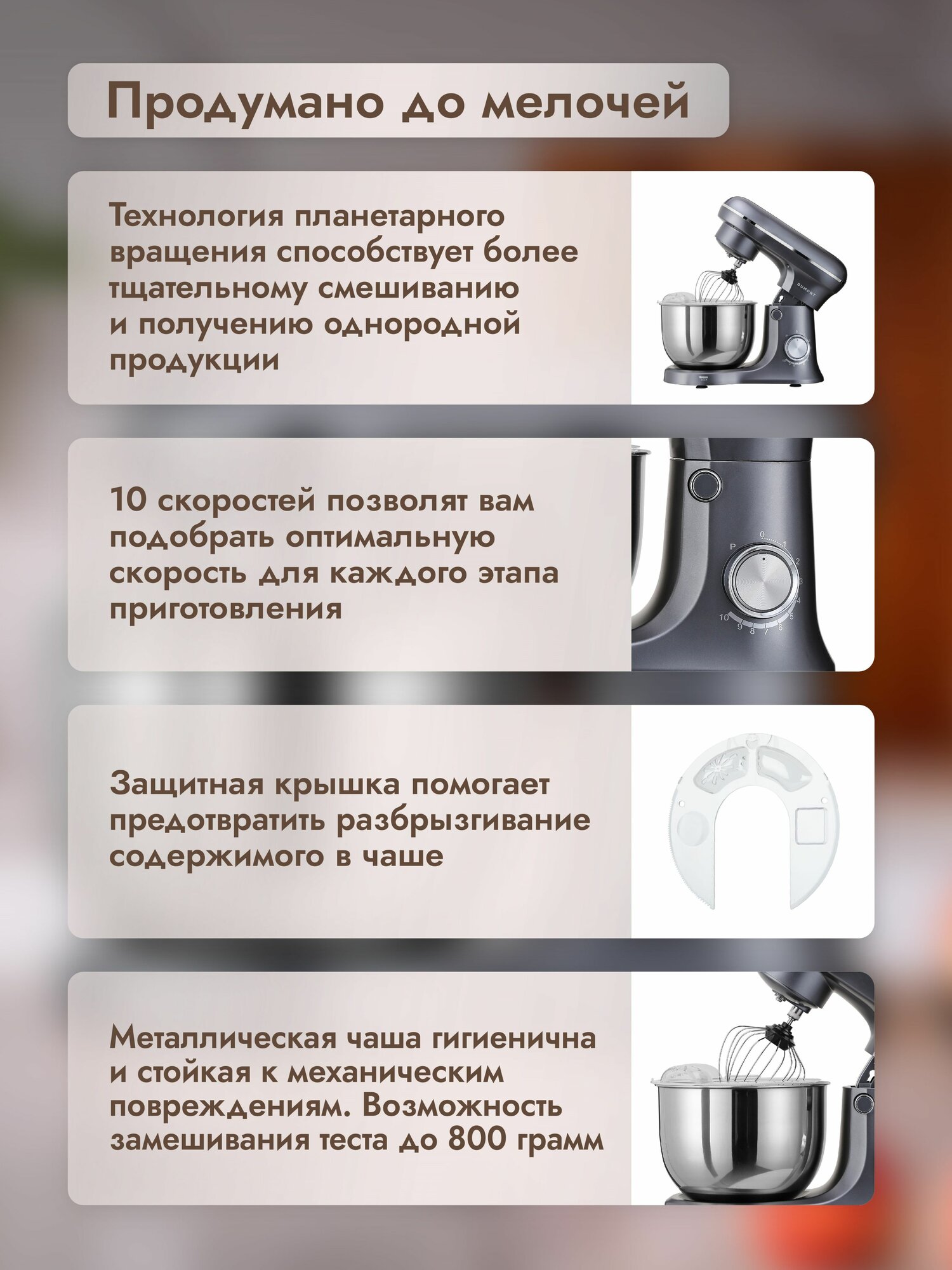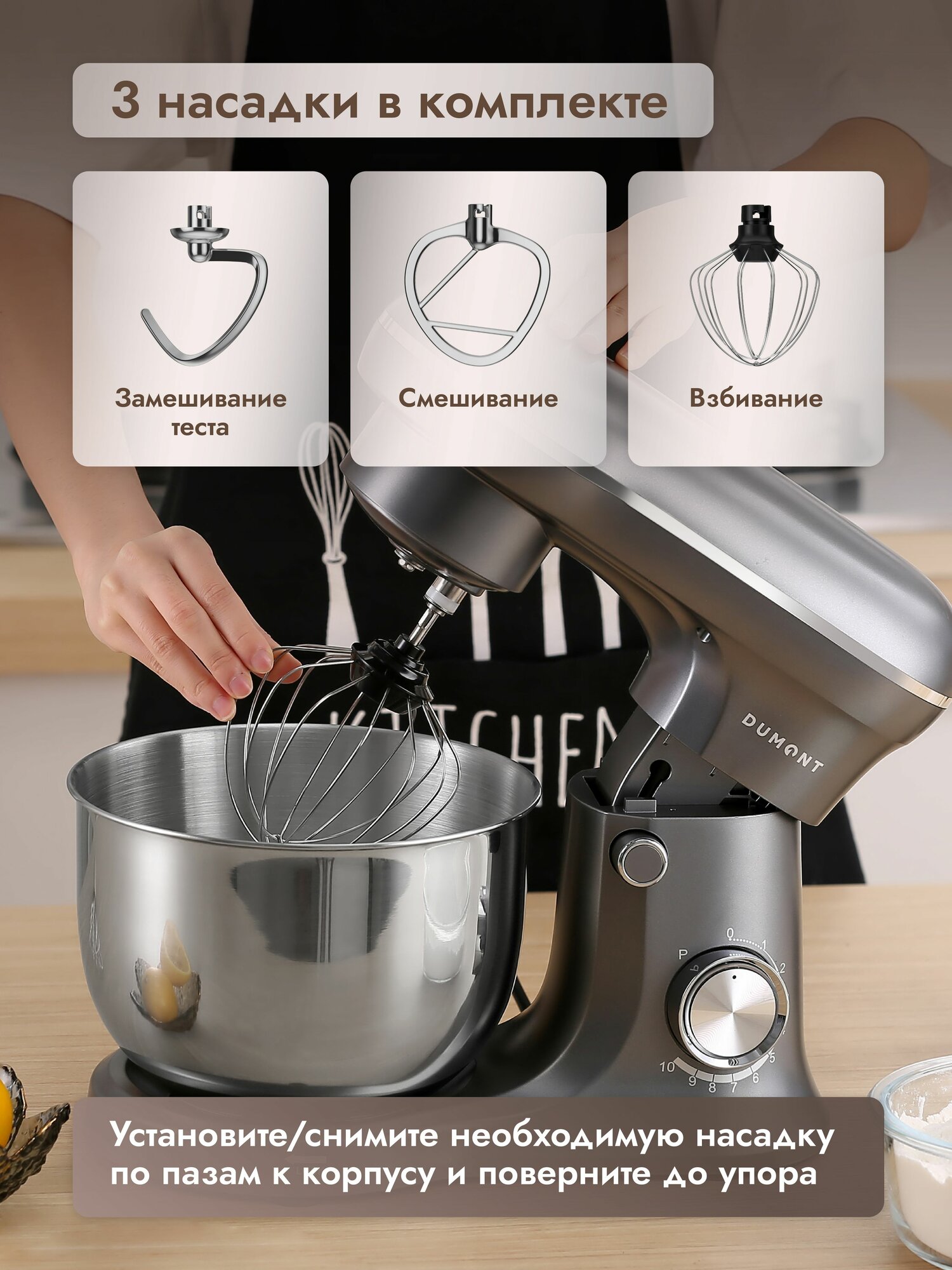 Планетарный миксер Dumont DMSM-2002, чаша 4.5 л, мощность 1600 Вт, 10 скоростей интересное: