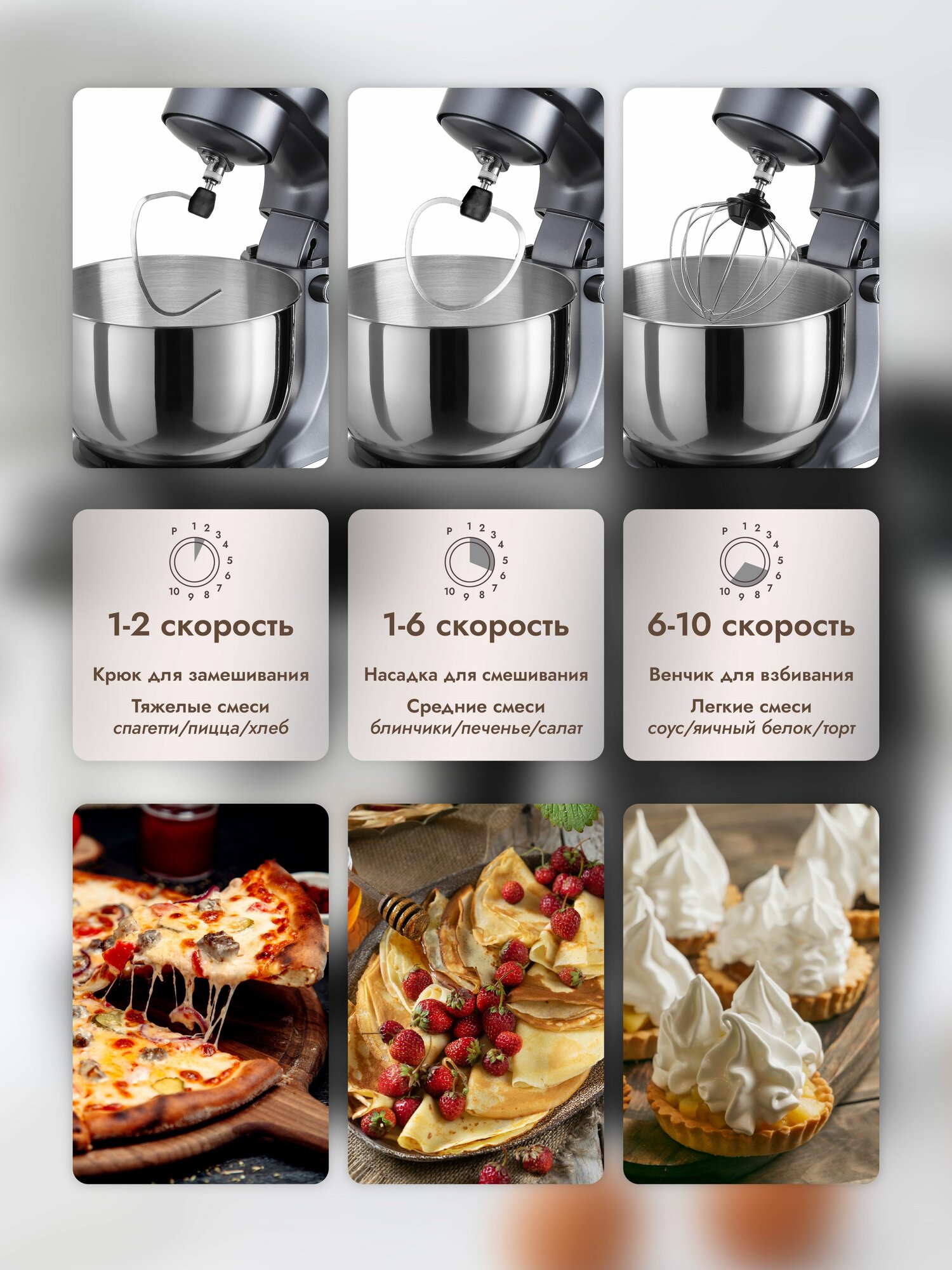 | Насадки | венчик для взбивания / крючки для замешивания теста / лопатка |