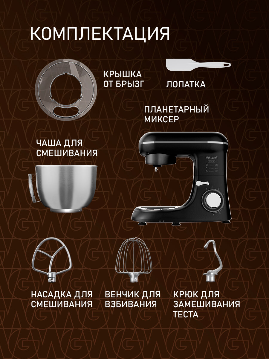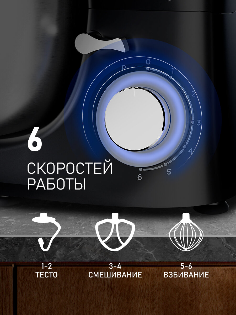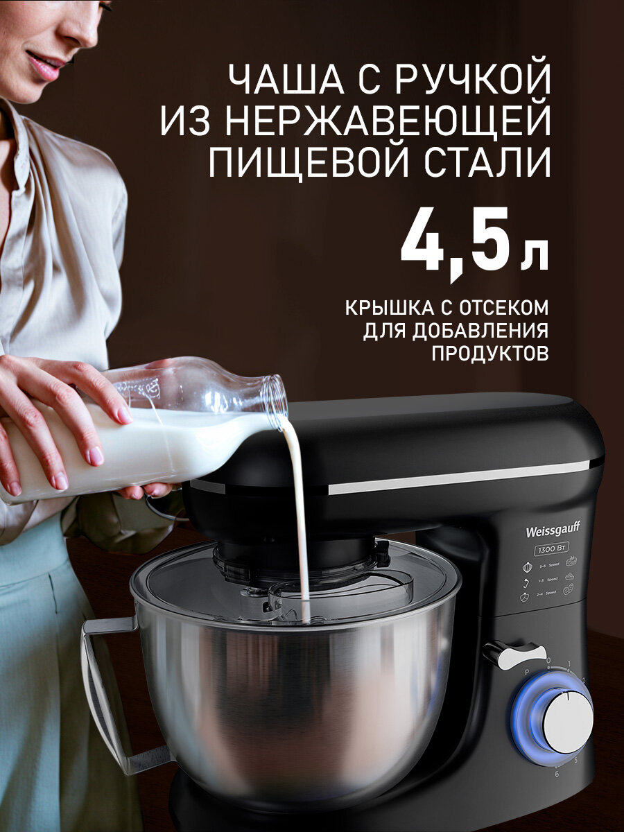 Миксер планетарный Weissgauff WSM 130 PMB PrimeChef, 6 скоростей работы, двигатель 1300 Вт, импульсный режим интересное: