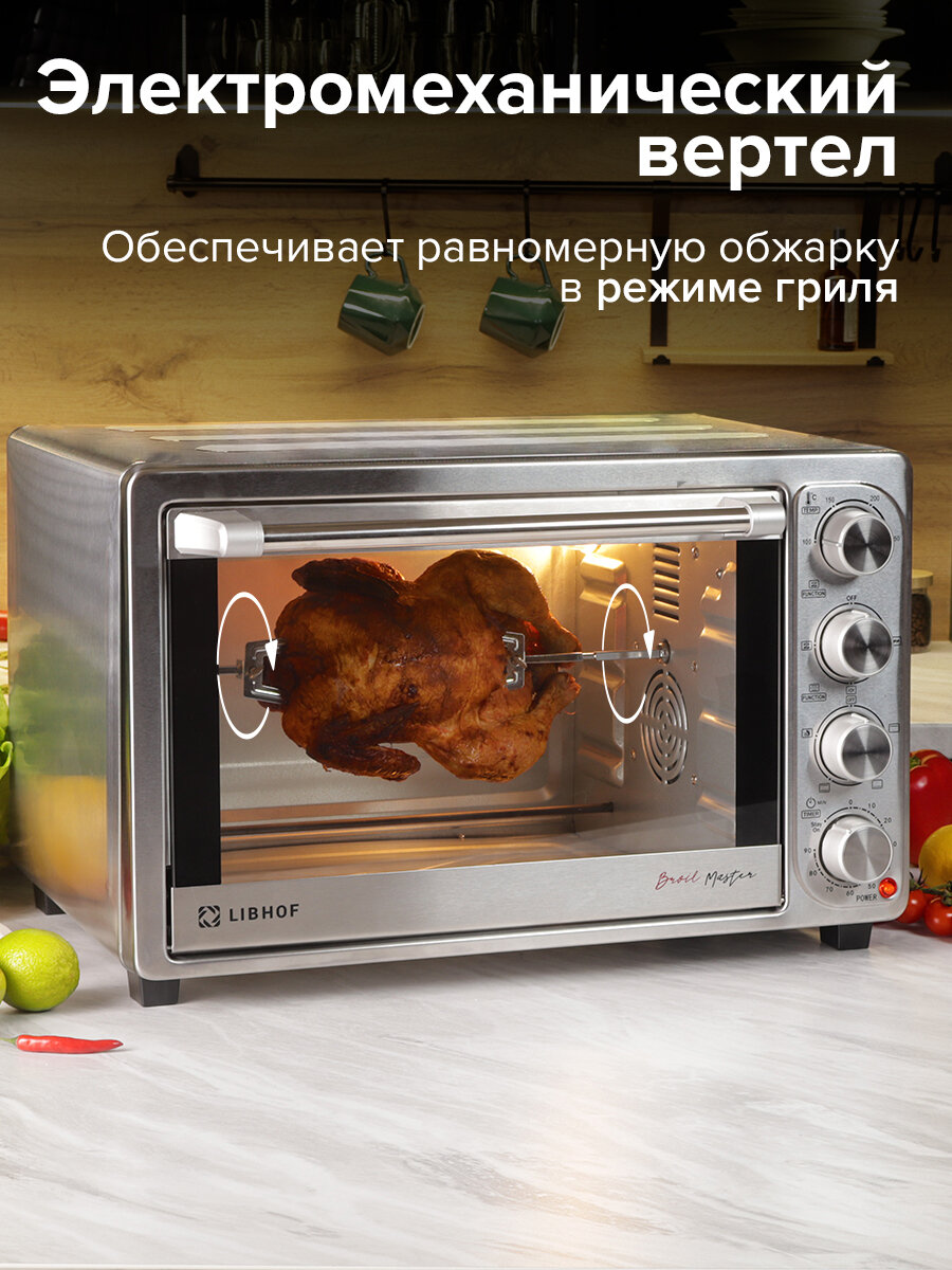 | В комплекте | вертел, держатель для противня/решётки, поддон для сбора крошек, противень, решётка, книга рецептов |