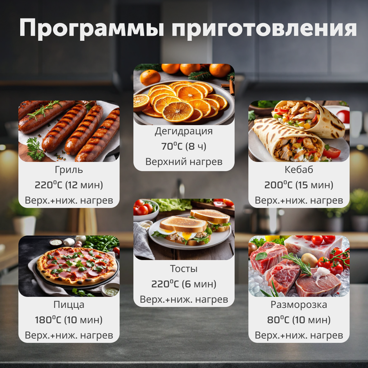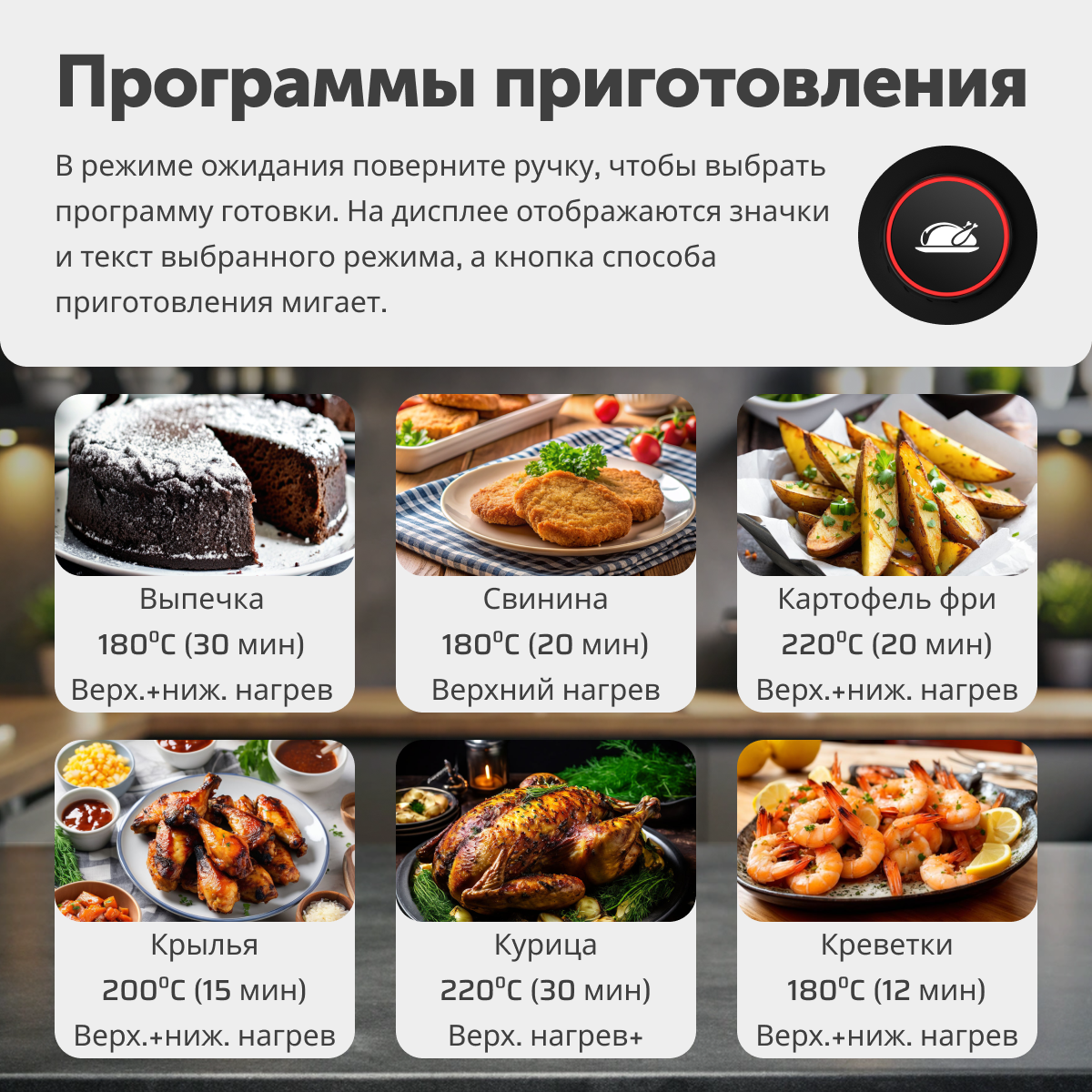 | Автоматические программы приготовления | выпечка, свинина, картофель фри, крылышки, курица, морепродукты, гриль, дегидрация (сухофрукты), кебаб, пицца, хлеб, размораживание |