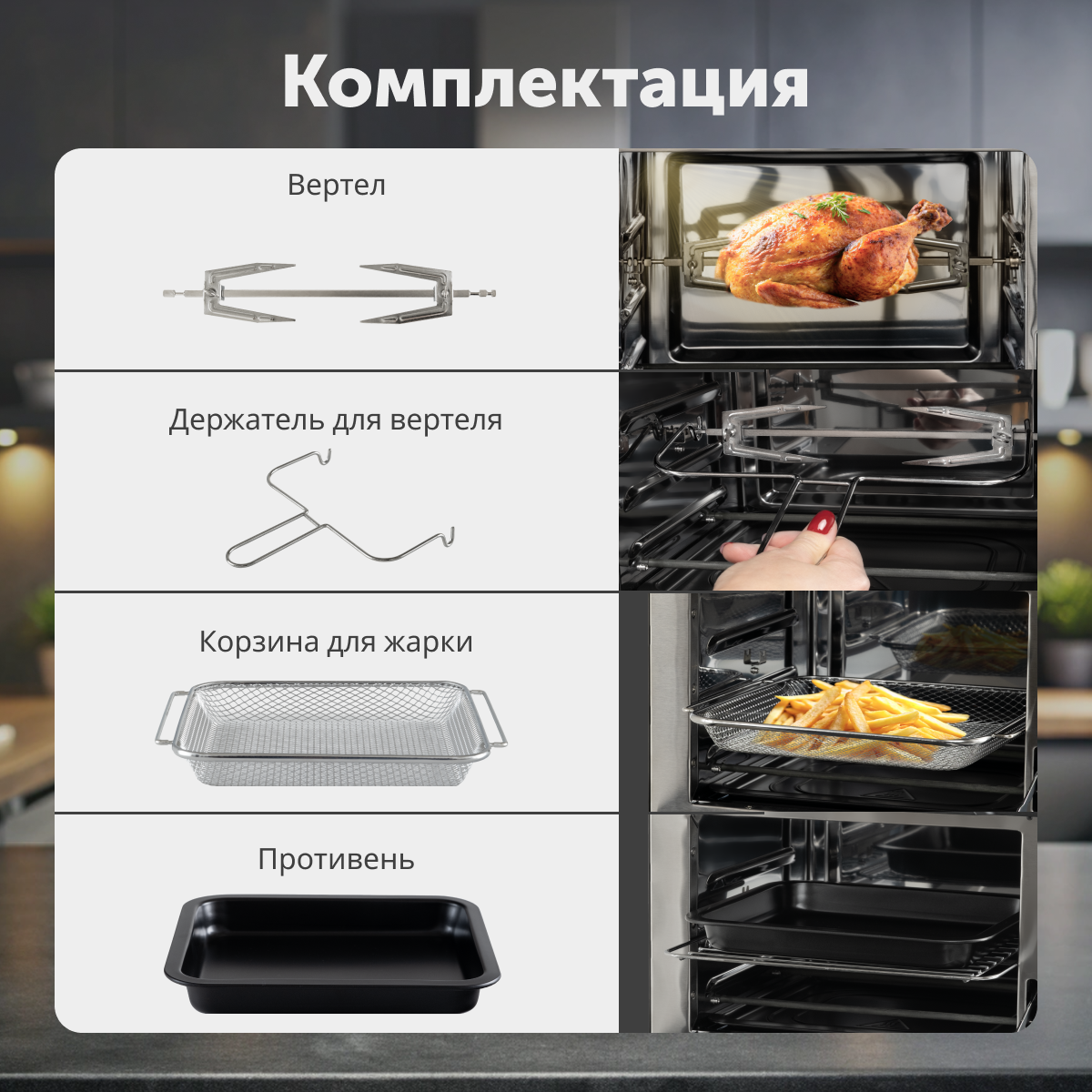 | В комплекте | противень, зажим для извлечения курицы, корзина для жарки, набор вилок для приготовления курицы, поддон для сбора капель, решетка для гриля, ручка для противня, форма для кекса |