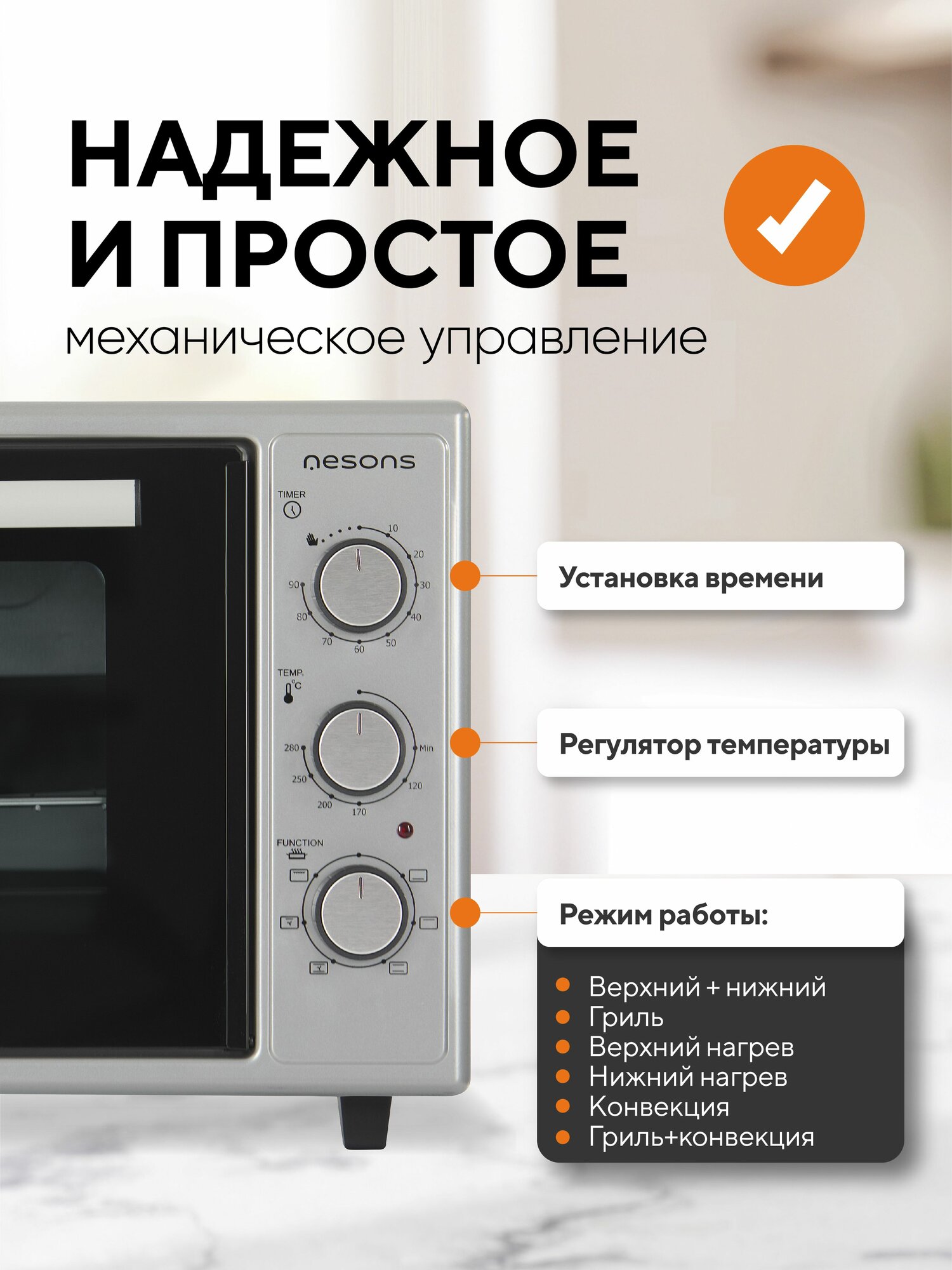 Электрическая мини-печь духовка настольная конвекция и гриль Nesons МО-48CW белый